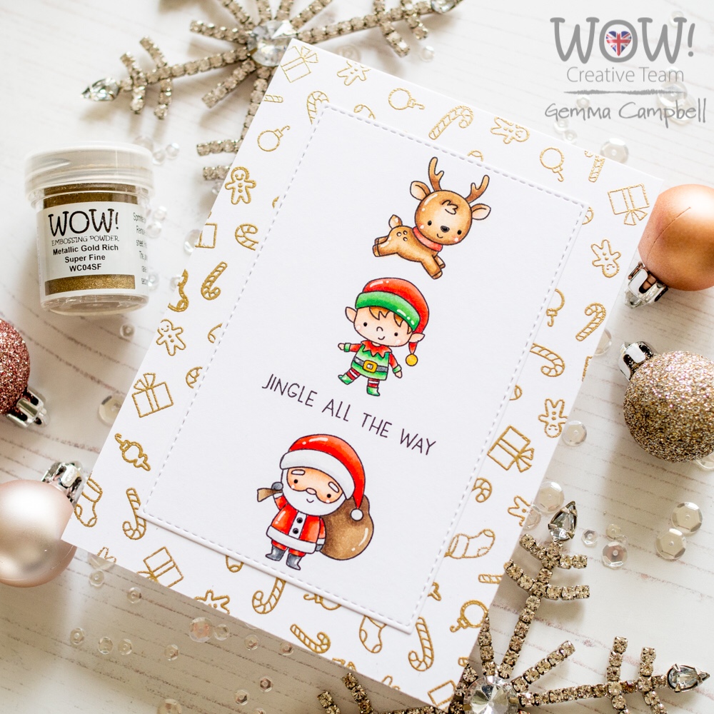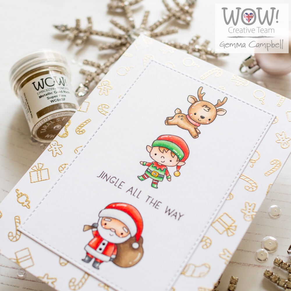 I began with a white card base. I stamped some of the smaller images from the Hello Bluebird North Pole Littles stamp set with WOW embossing ink around the edges of the card, then heat embossed them with WOW Metallic Gold Rich Super Fine embossing powder. I love the look of the gold embossed border, which is perfect for Christmas cards.