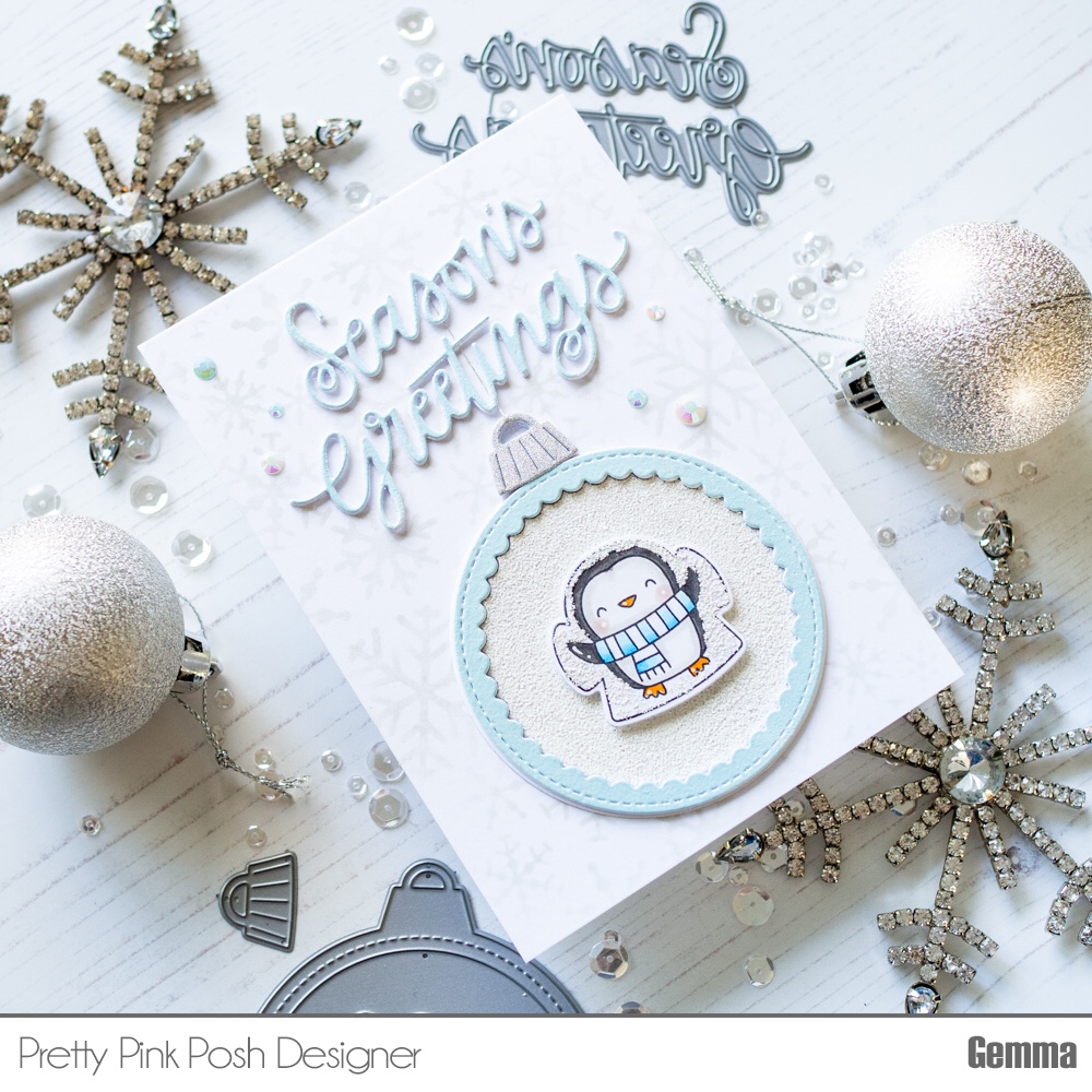 Today I have a cute card to share, featuring some lovely November release products from Pretty Pink Posh – Penguin Pals, Season’s Greetings Script die and the Ornament Shaker die. This fabulous release is available to purchase today!