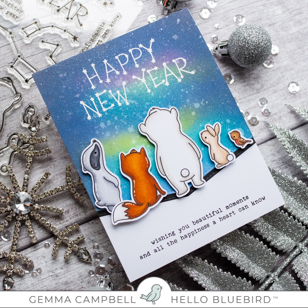 I used distress oxides to blend a northern lights sky on to Bristol Smooth card. I flicked it with white paint and pewter perfect pearls for stars.