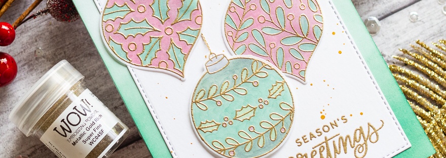 I love to use gold and silver embossing powders on my Christmas cards, as it makes them look extra special. I used the WOW Metallic Gold Rich embossing powder on this card, featuring the Decorative Ornaments set from Pretty Pink Posh.