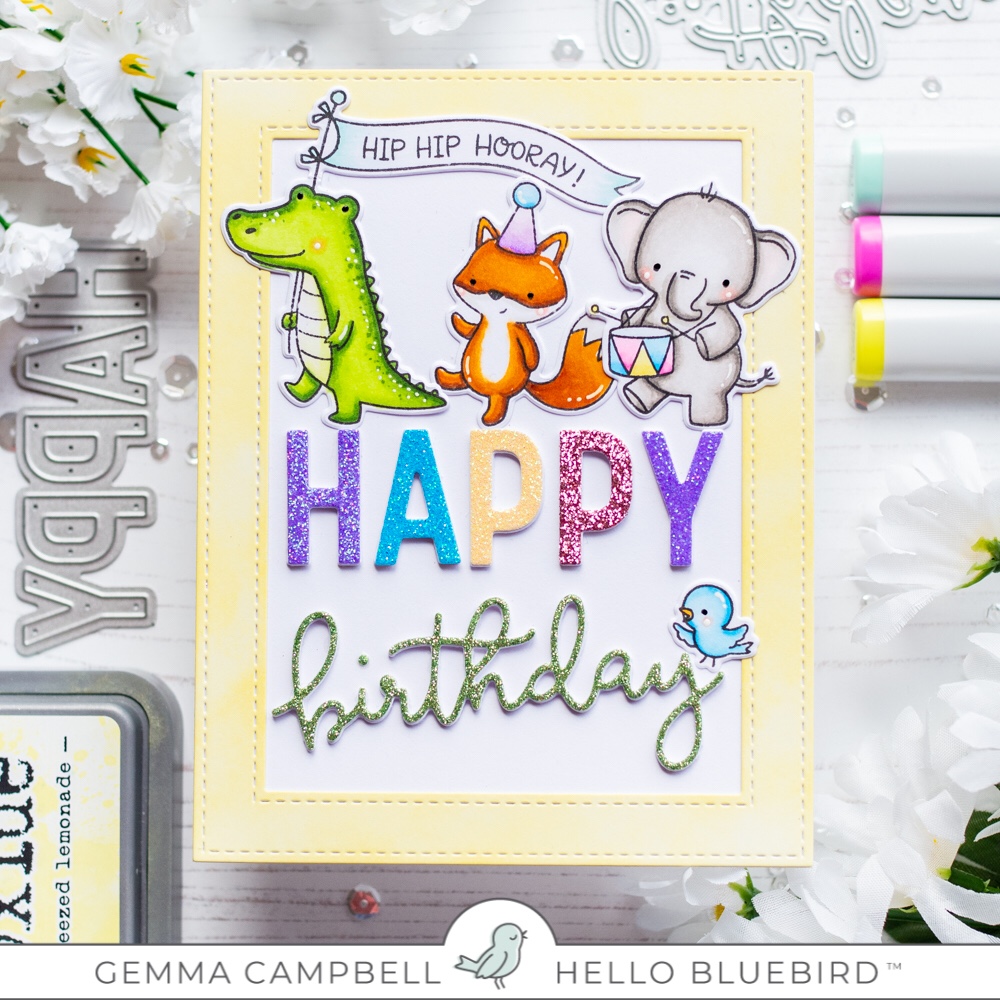 Today I have a fun birthday card to share, featuring the new Party Parade stamp set and Happy Birthday die set from Hello Bluebird.