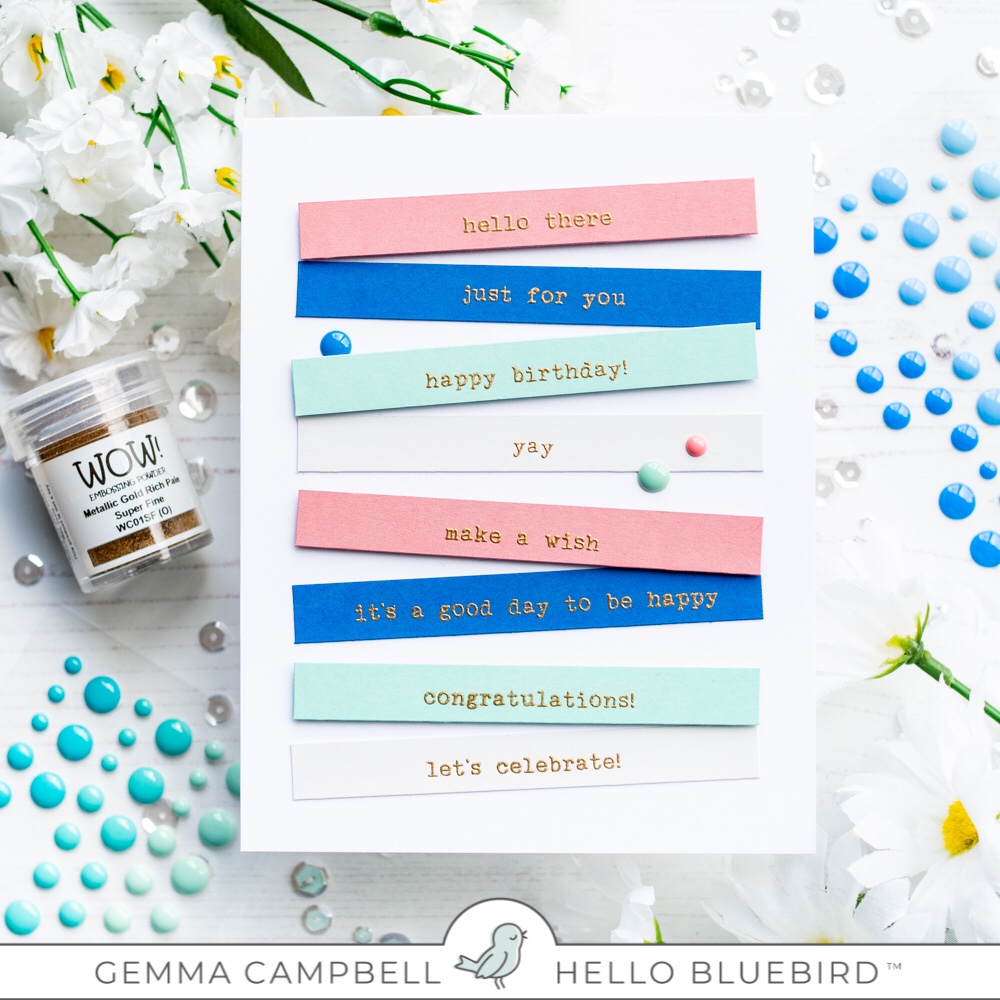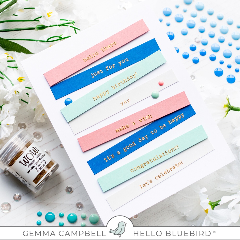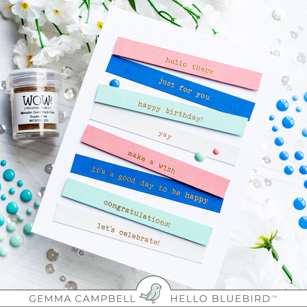 I chose 8 sentiments from the Typed Everyday stamp set, and embossed one on each of the card strips. I used WOW clear embossing ink to stamp the sentiments, then heat embossed them using WOW Metallic Gold Rich Pale embossing powder.