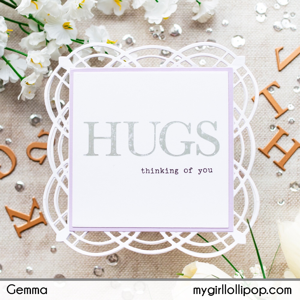 After foiling the word HUGS with the Matte Silver foil, I cut my card into a square using a die from the Spellbinders Adoria Square Shadowbox Frame die set. It’s easier to foil on a larger piece of card first, then die cut afterwards to ensure the word is straight. Underneath the foiling, I stamped a sentiment from the Hello Bluebird Typed Everyday stamp set.