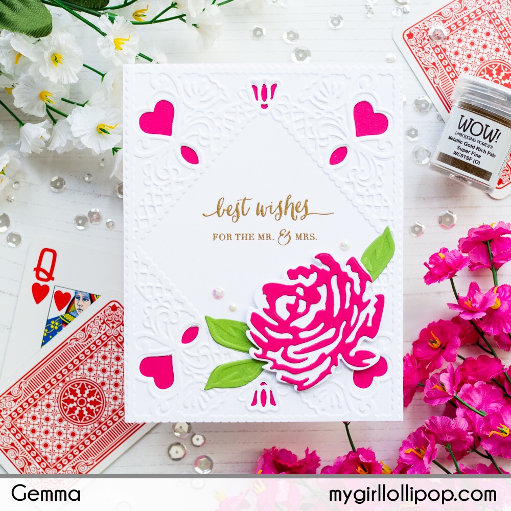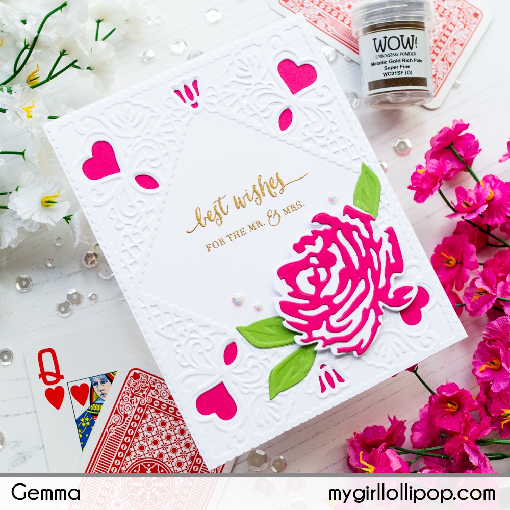 I chose one of my favourite wedding sentiments, from the WPlus9 Fresh Cut Wreaths stamp set. I heat embossed it with WOW Metallic Gold Rich Pale embossing powder, then layered the white card over a piece of Sweet Berry FSJ card.