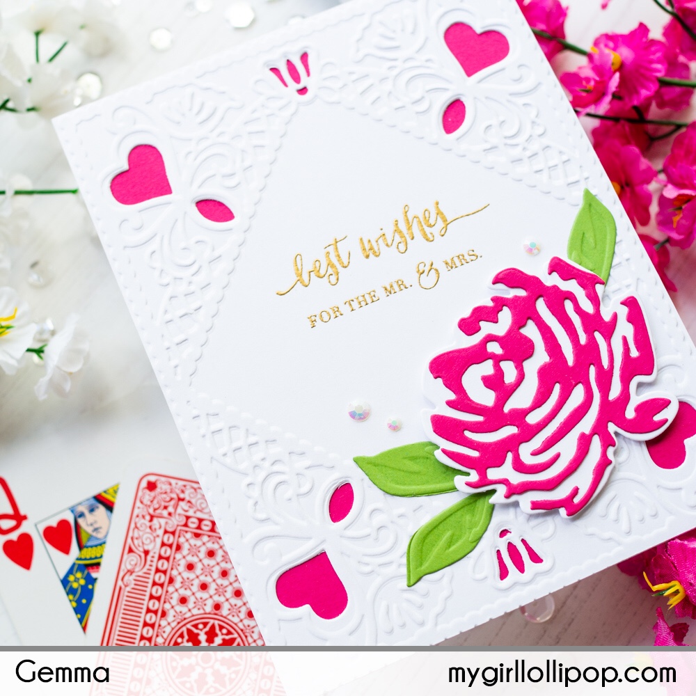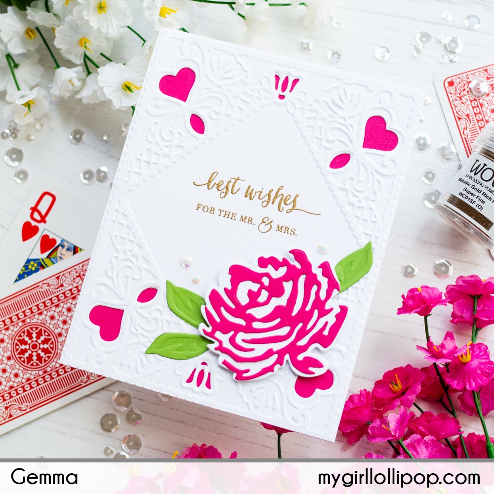 Today I have a wedding card to share featuring the Diamond Lace Frame Cut & Emboss folder from Spellbinders. These special embossing folders have etched dies embedded inside so they cut and emboss in one pass to give a beautiful textured card background.