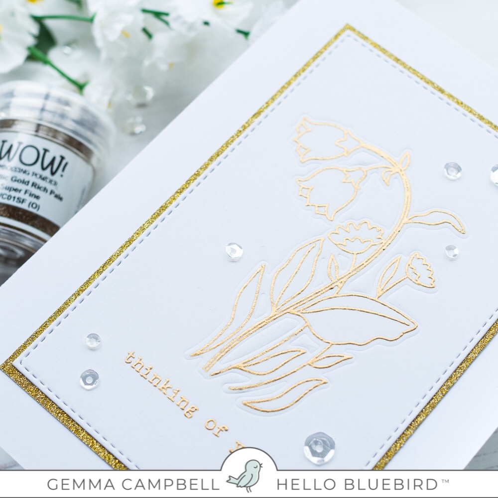I then stamped the bluebell image onto the card with WOW clear embossing ink, and heat embossed with WOW Metallic Gold Rich Pale embossing powder. I also heat embossed a sentiment from Typed Everyday underneath the bluebells.