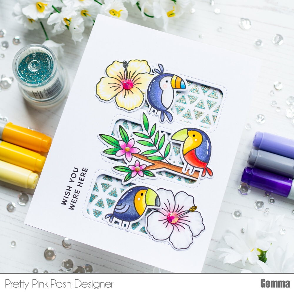 Today I have a card showcasing some of the fabulous new June release from Pretty Pink Posh. These cute birds and the branch are from the Tropical Toucans stamp set. I love the size as it means I can fit all three of them on my card together.
