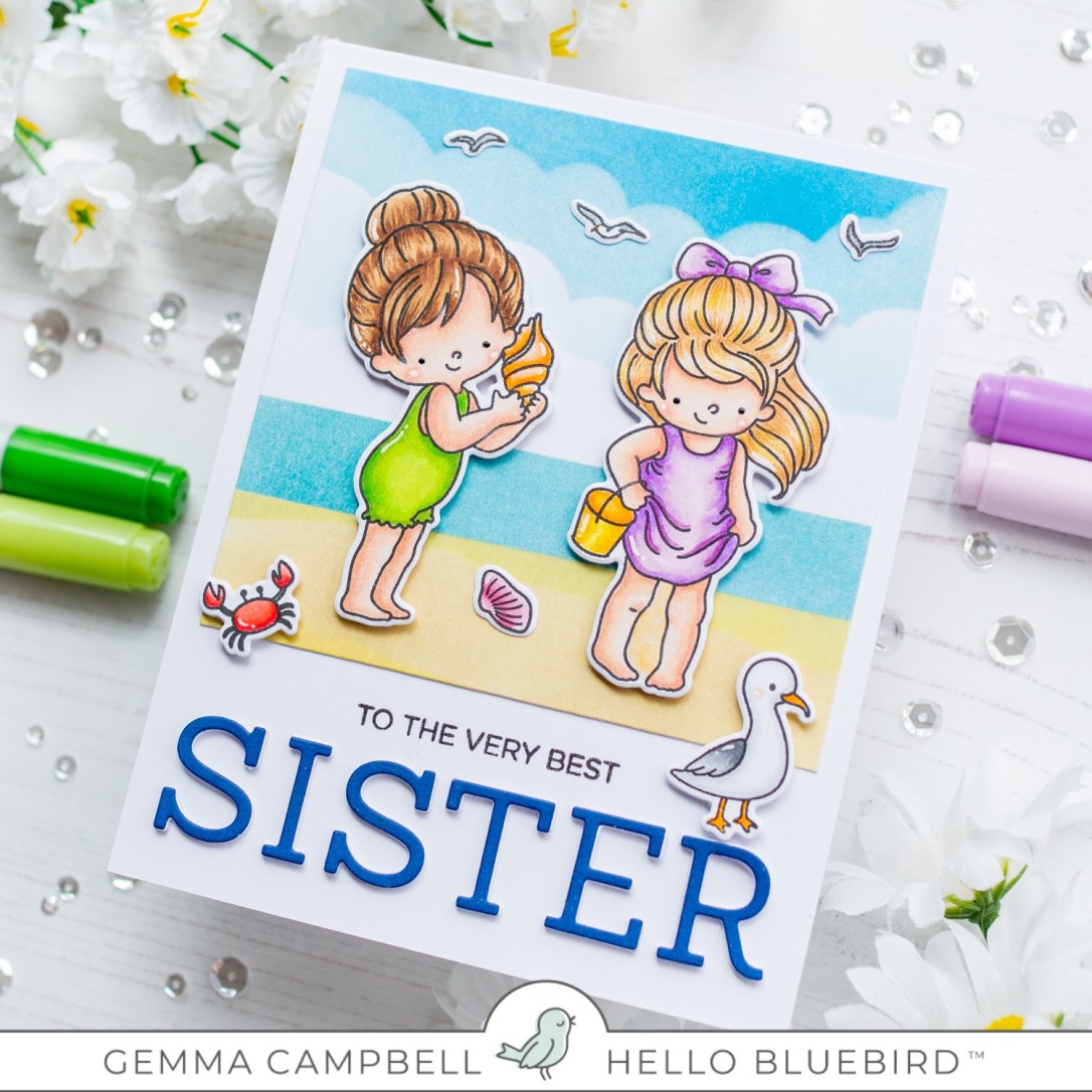 Today I’m showcasing the new Seaside Girls stamp set. I teamed it with the new Oliver Alpha dies to create a card inspired by the vintage railway posters you find in the U.K.