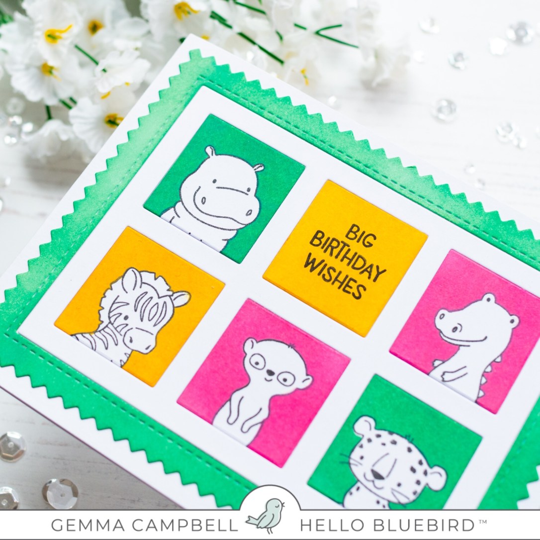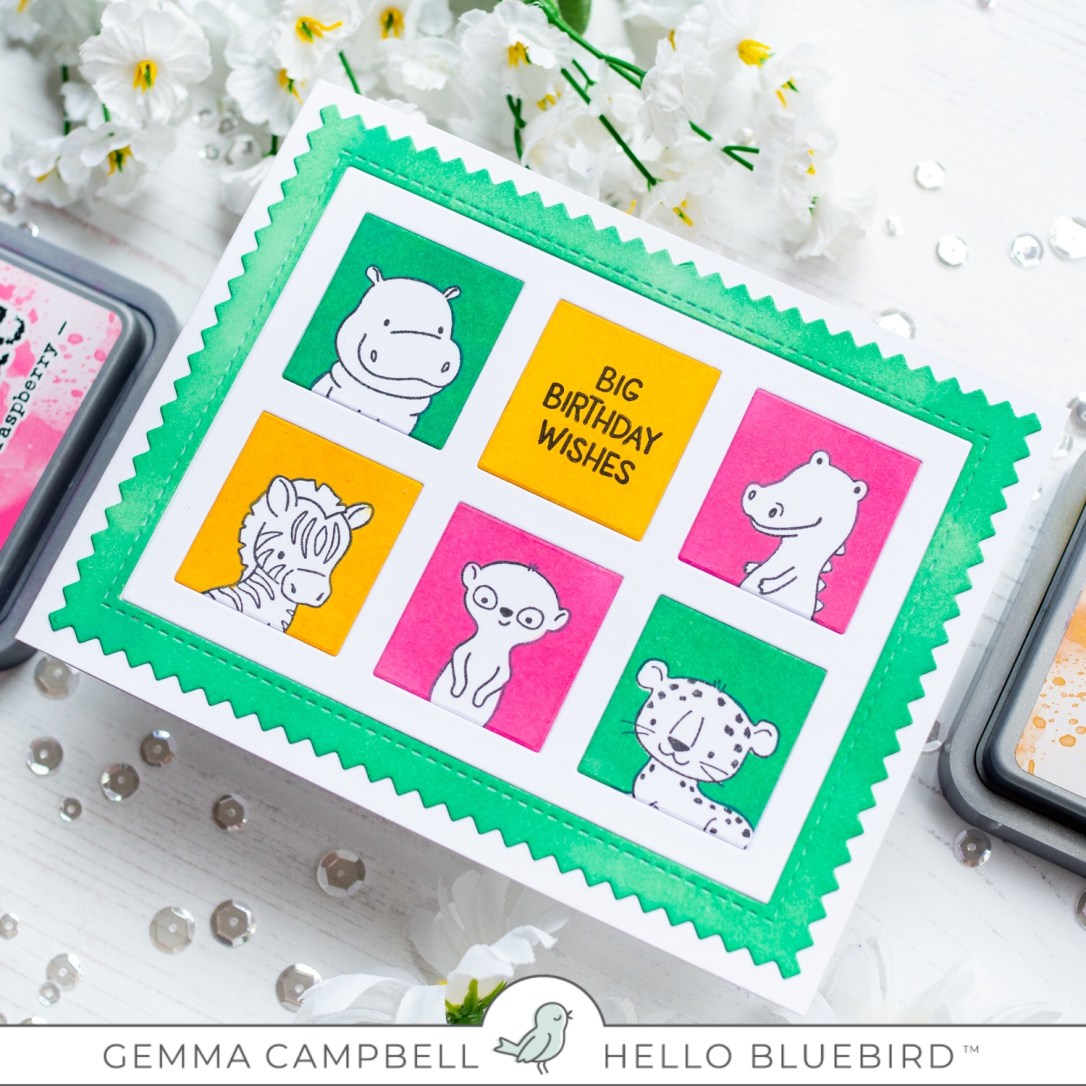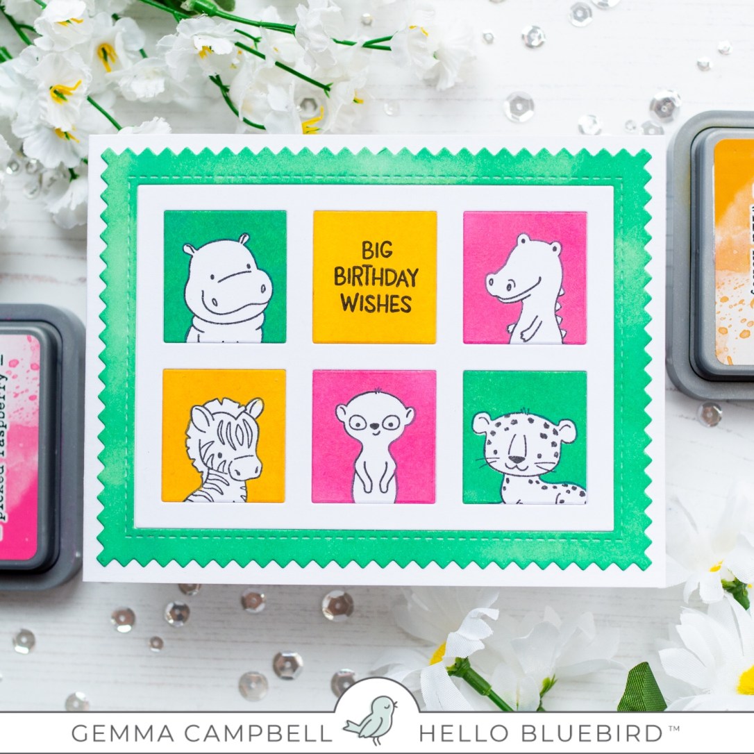 I chose some bright colours of distress oxide ink – picked raspberry, wild honey, and lucky clover. I added colour to the outer frame and all 6 squares, then removed the masks to reveal the stamped animals.