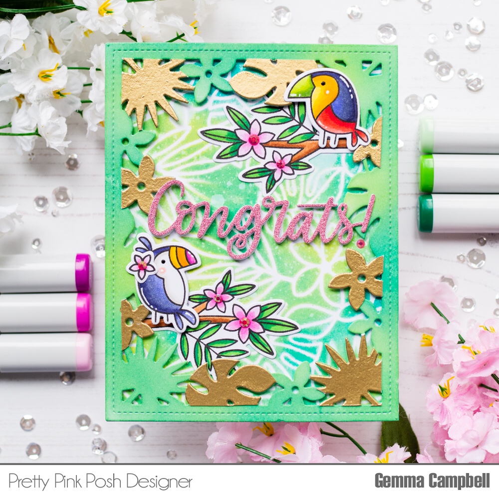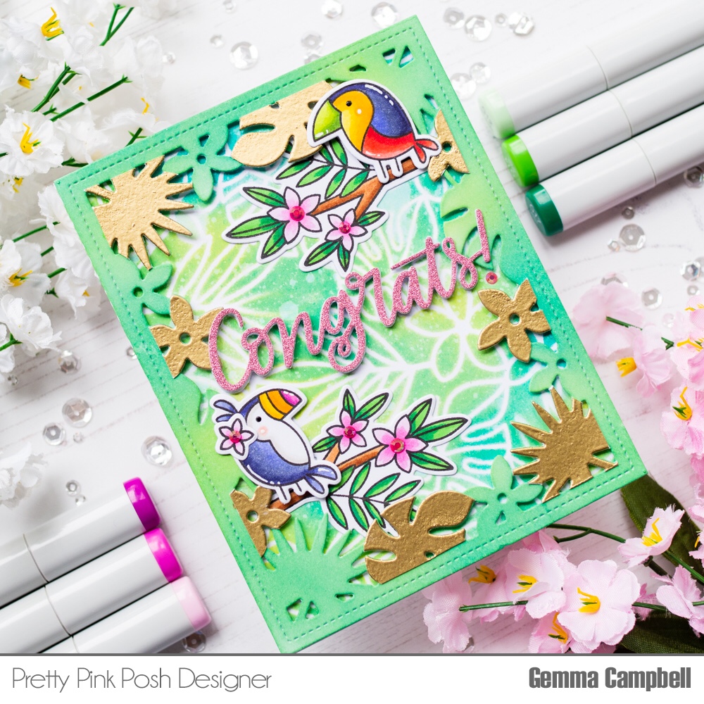 I stamped and coloured some images from the Tropical Toucans , colouring them with copics and die cutting with the coordinating dies. I adhered the branches with liquid glue, then the toucans with foam squares.