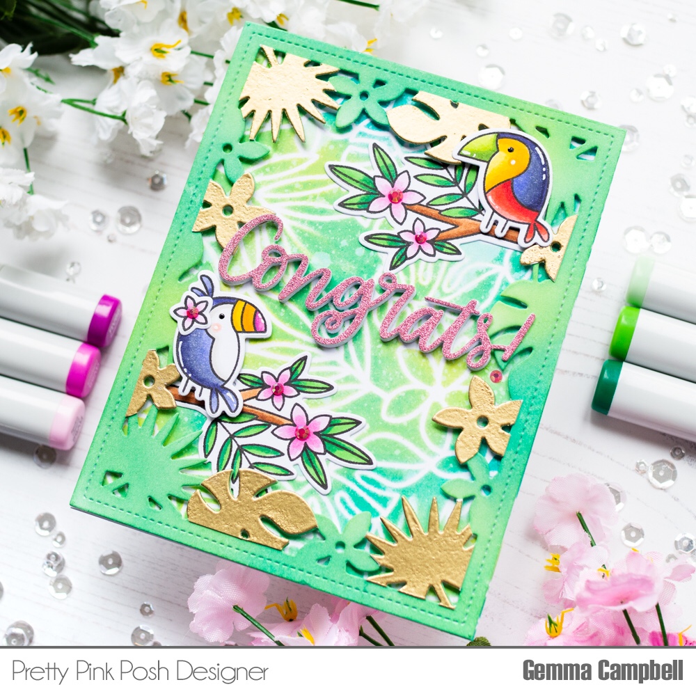 On my card base, I used the new Tropical background stencil. I then layered my Tropical Frame over the top with foam tape.