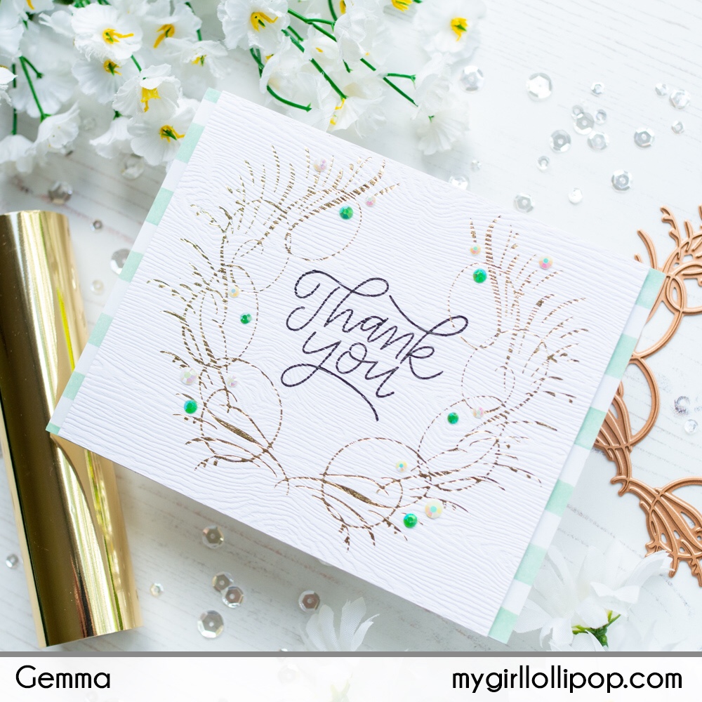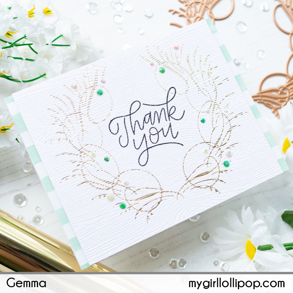 For my first card, I used the beautiful PA Scribe Monogram Laurel glimmer plate with Champagne foil to add the design to a piece of Lawn Fawn white woodgrain card. I was very pleased with how well the foiling worked on this textured card.