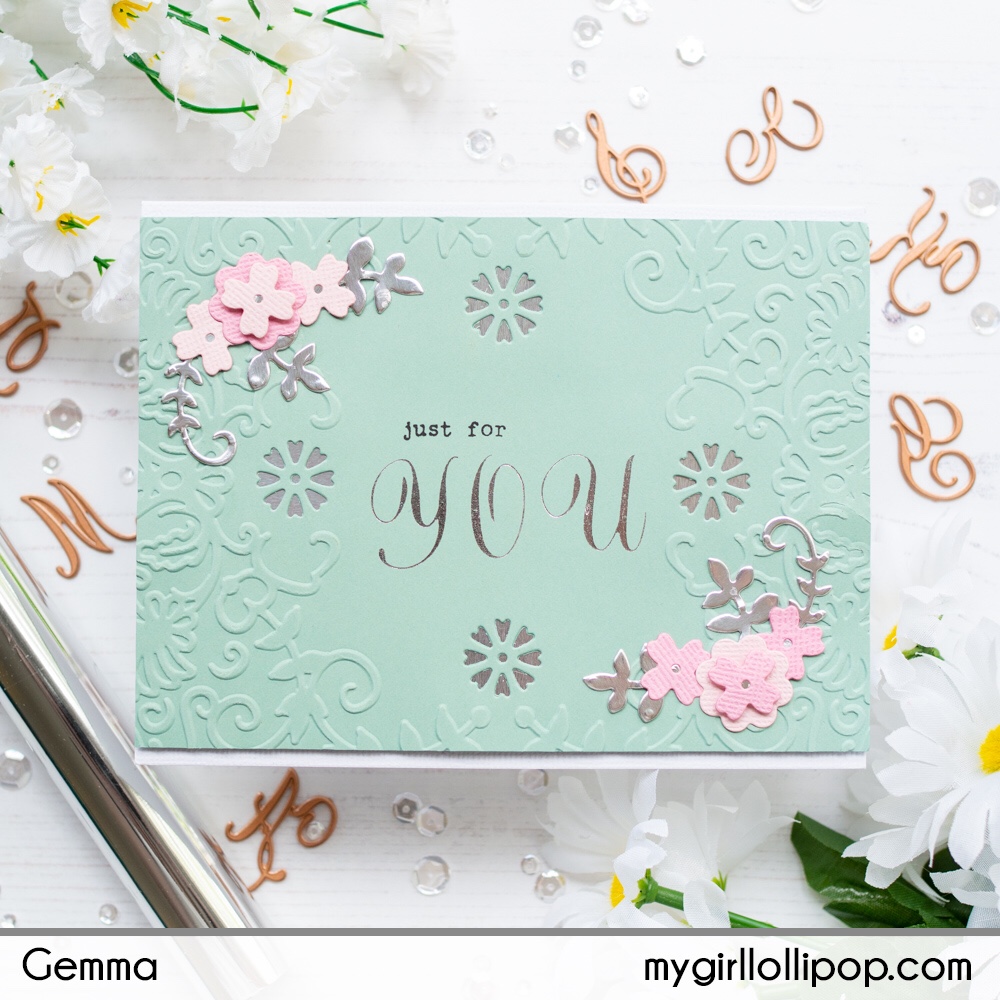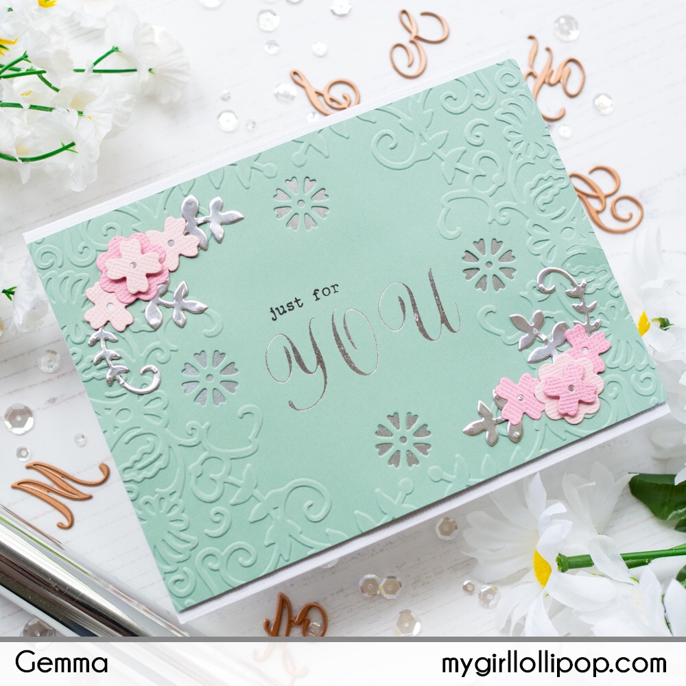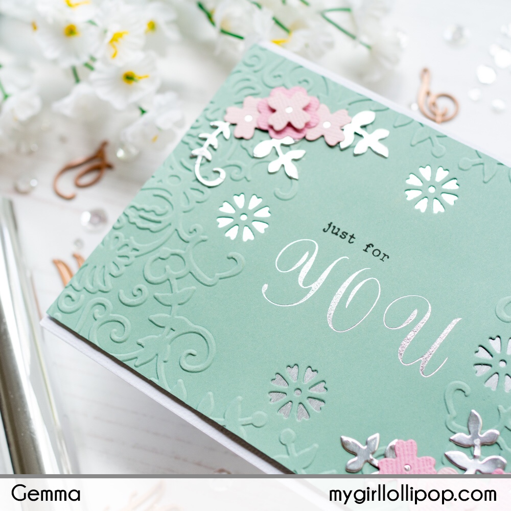 I layered some silver mirror card behind the die cut flowers then added the panel to my card base with foam tape.