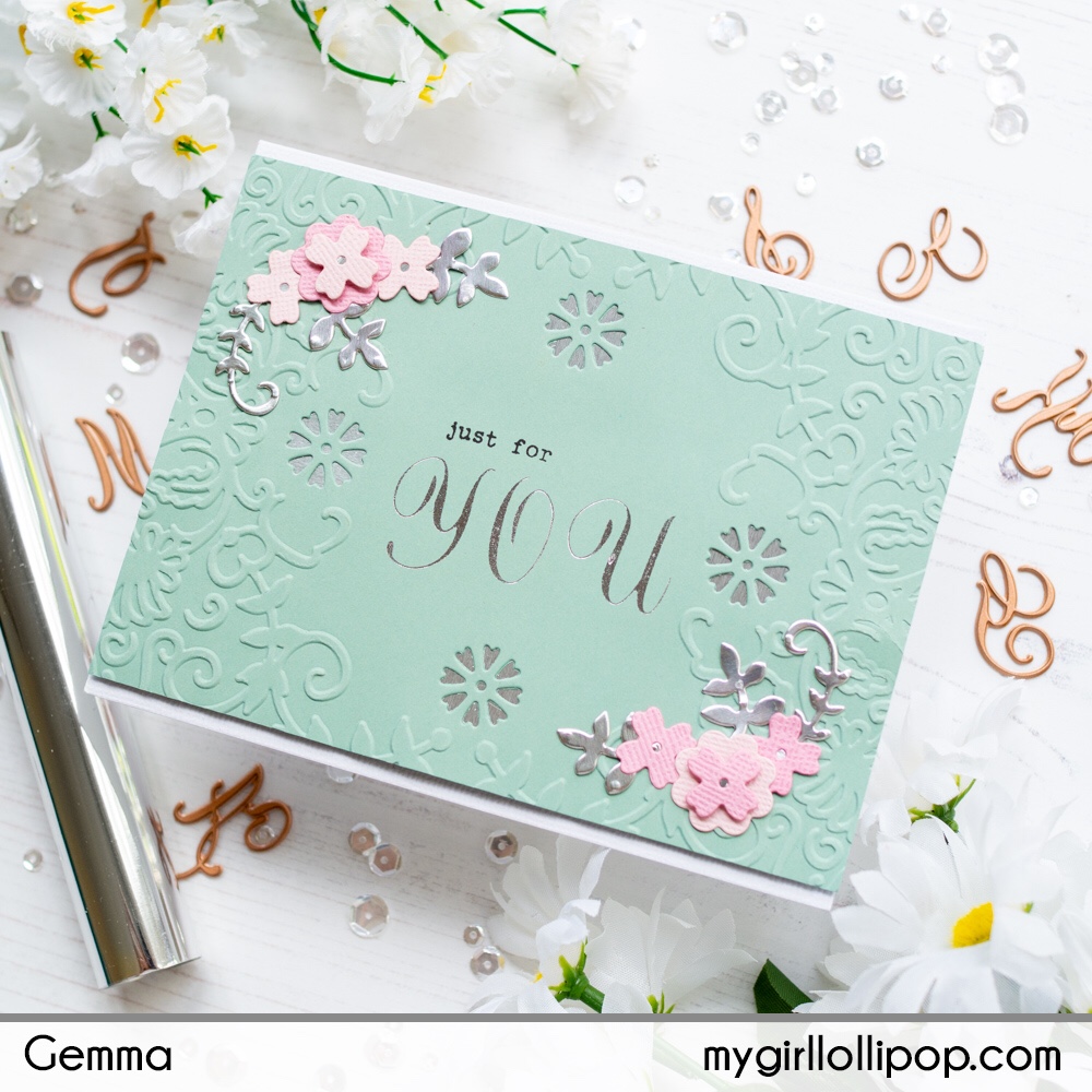 Next, I lined up the glimmer plate letters on my card to spell ‘you’. I secured them with some low tack tape, so they foil exactly where I want. I used some silver foil this time. I then stamped an accompanying sentiment above the foiling, using a stamped from the Hello Bluebird Typed Everyday stamp set.