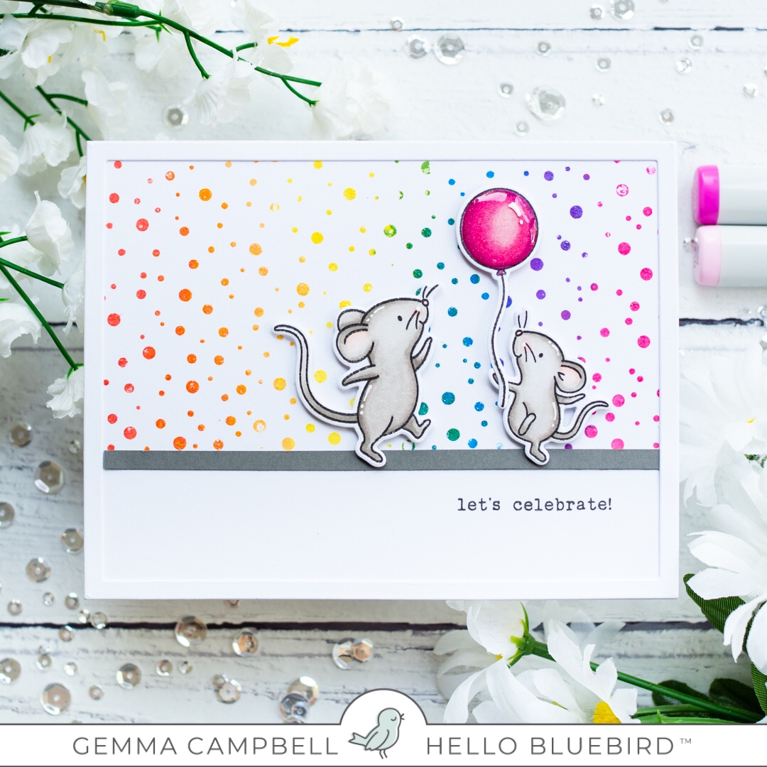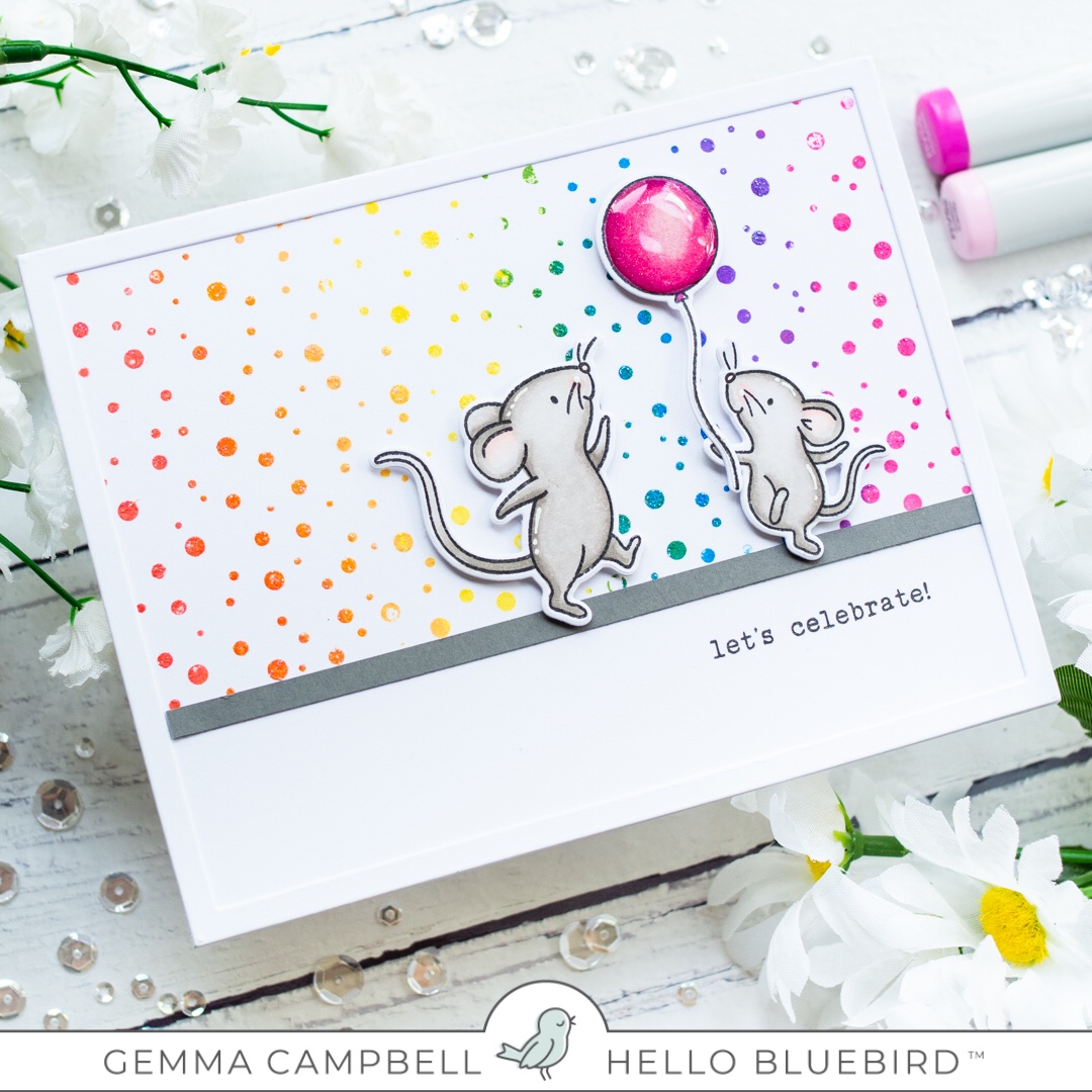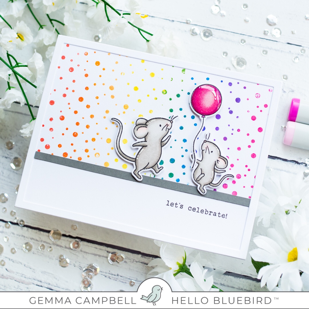 As the previously released background stamps will also be restocked, I’ll be showcasing new ways to use a couple of them. My card today uses the Hello Bluebird Falling Snow background stamp. By using rainbow colours, it becomes a confetti background, perfect for a celebration card.