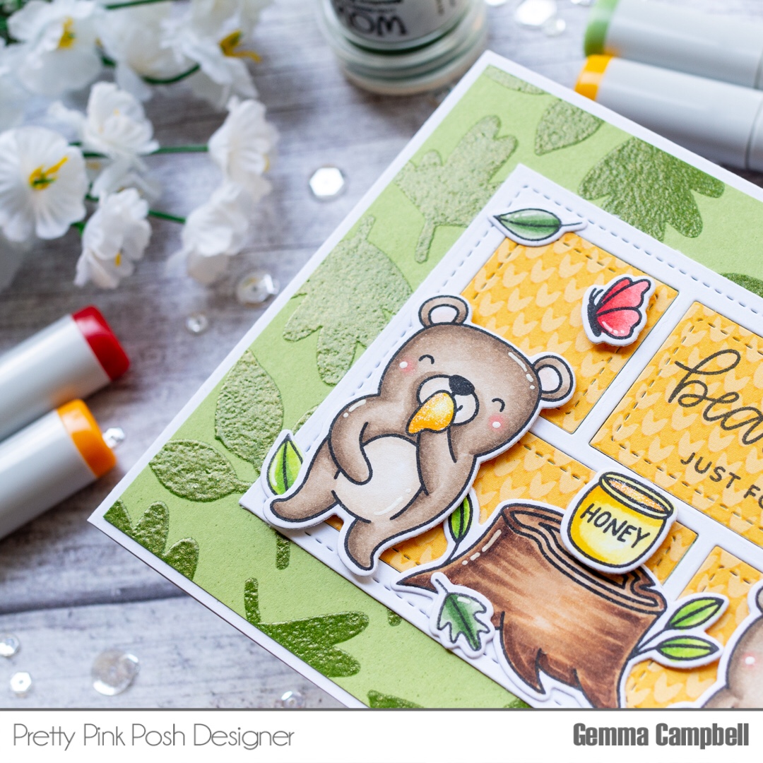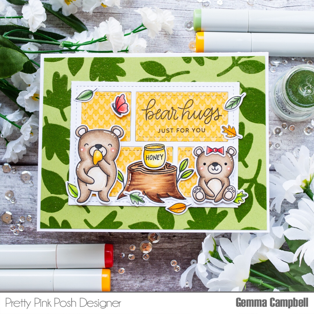 My card today features the new Bear Friends set and Autumn Leaves stencil from Pretty Pink Posh.