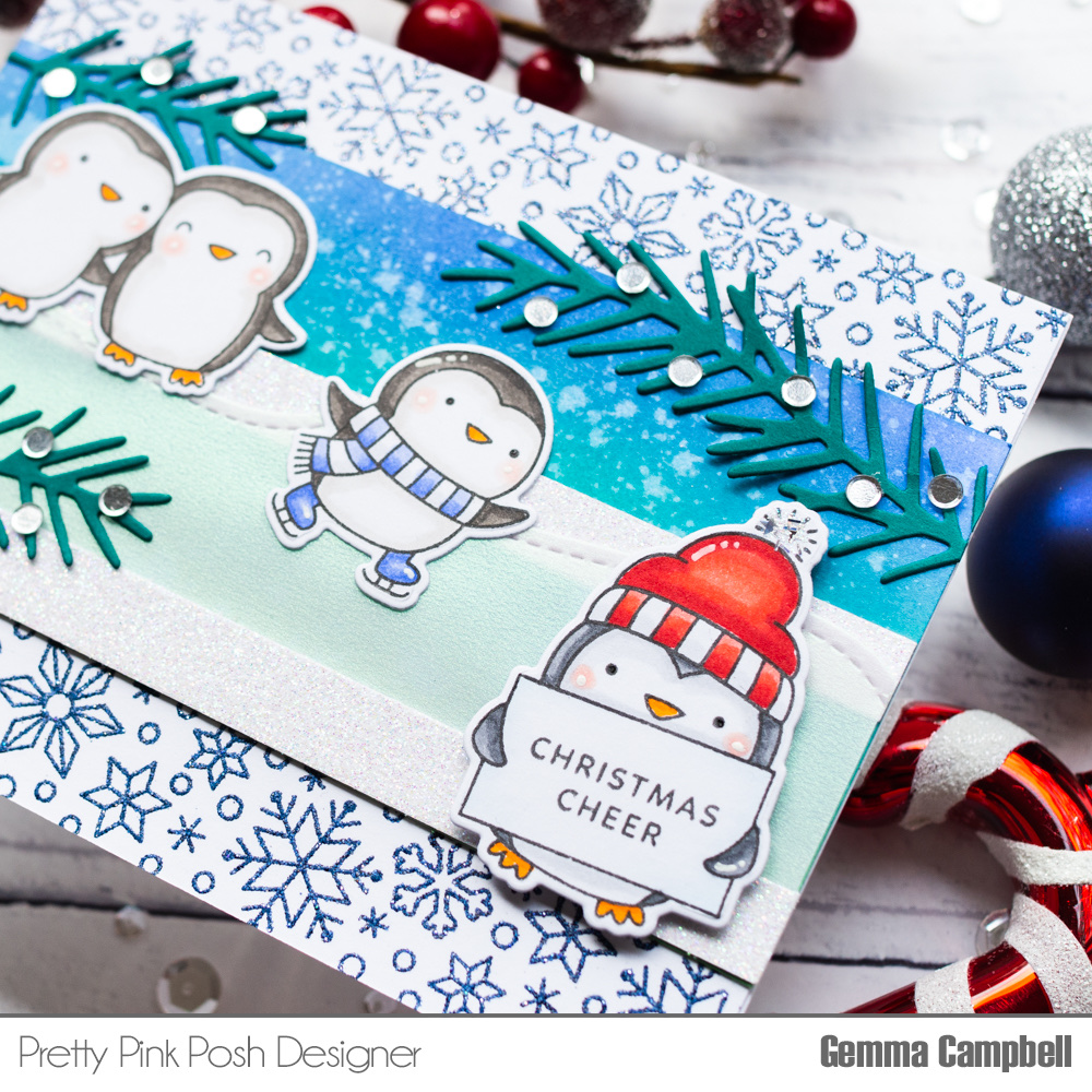 Today I have a card to share featuring the adorable penguin from the Pretty Pink Posh Holiday Signs set. I teamed it with the new Winter Borders and the previously released Penguin Pals stamp set and Pine Sprigs dies.