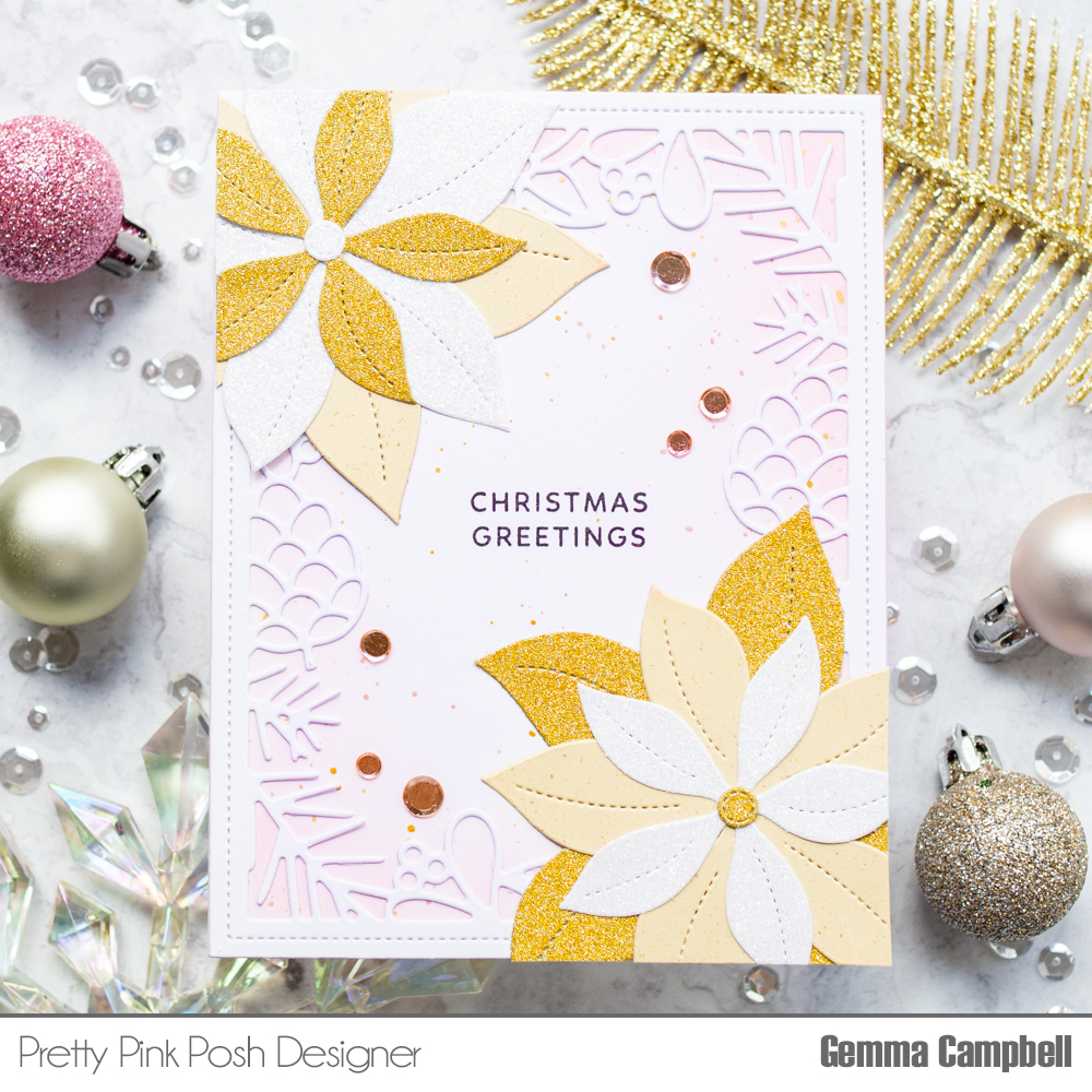 I love soft pastel colours for Christmas cards. Pink and gold is a favourite colour combo of mine, so I thought I’d use these colours with some of the new Pretty Pink Posh October release.