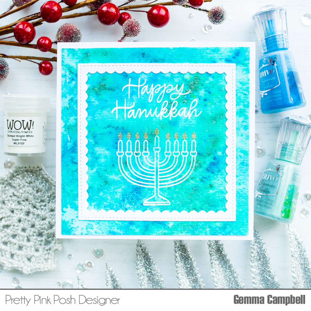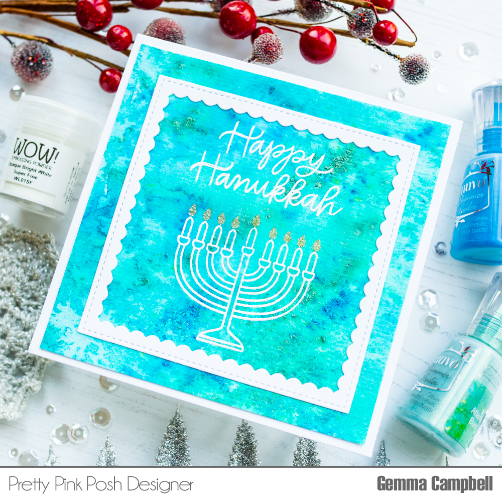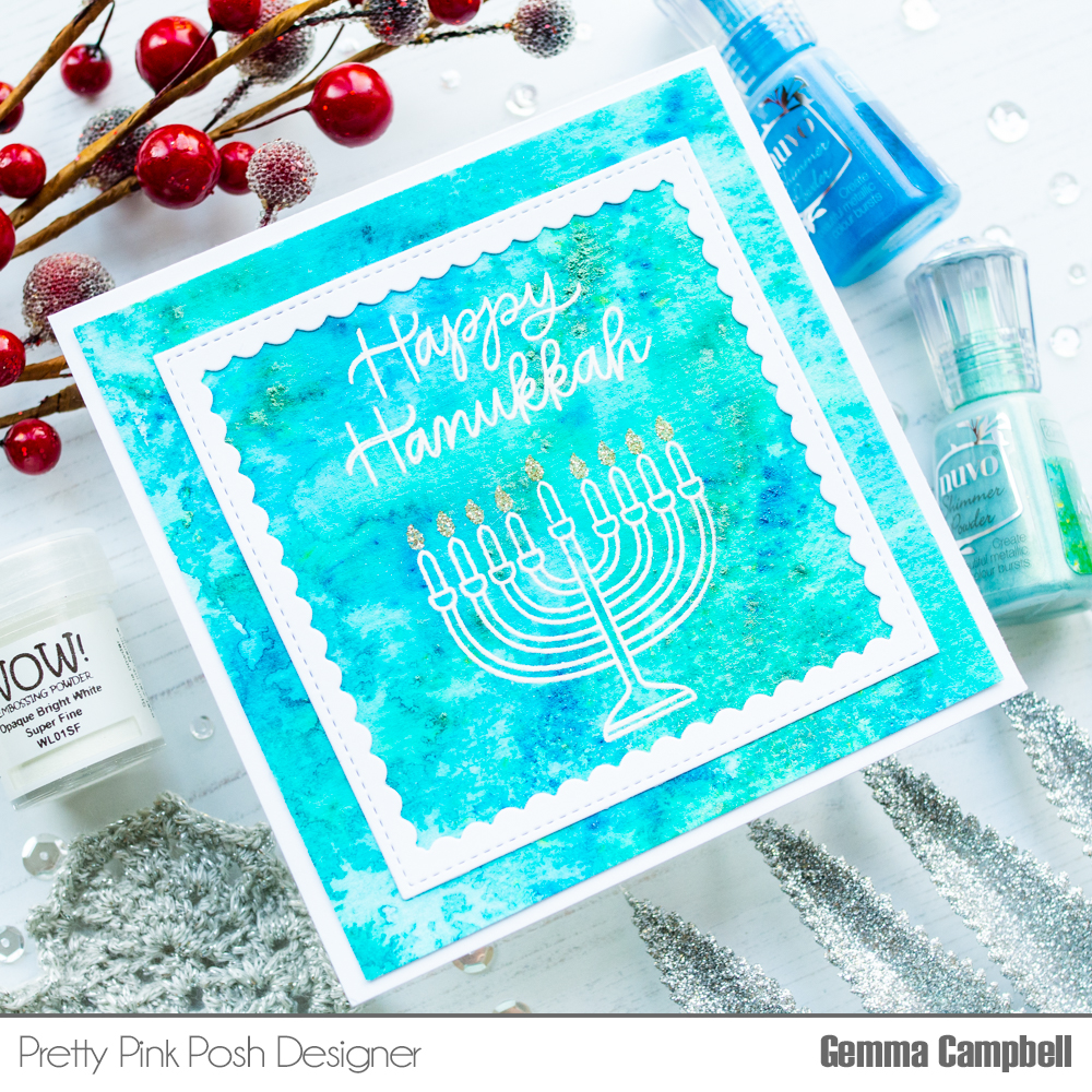 I arranged the images from the Happy Hanukkah stamp set on my background, stamped them with WOW clear embossing ink, then embossed them with WOW Opaque Bright White embossing powder. The embossing did sink in to the watercolour card more than I wanted so I stamped the images and embossed them a second time. The alignment was slightly off on the words but, otherwise, this worked well.
