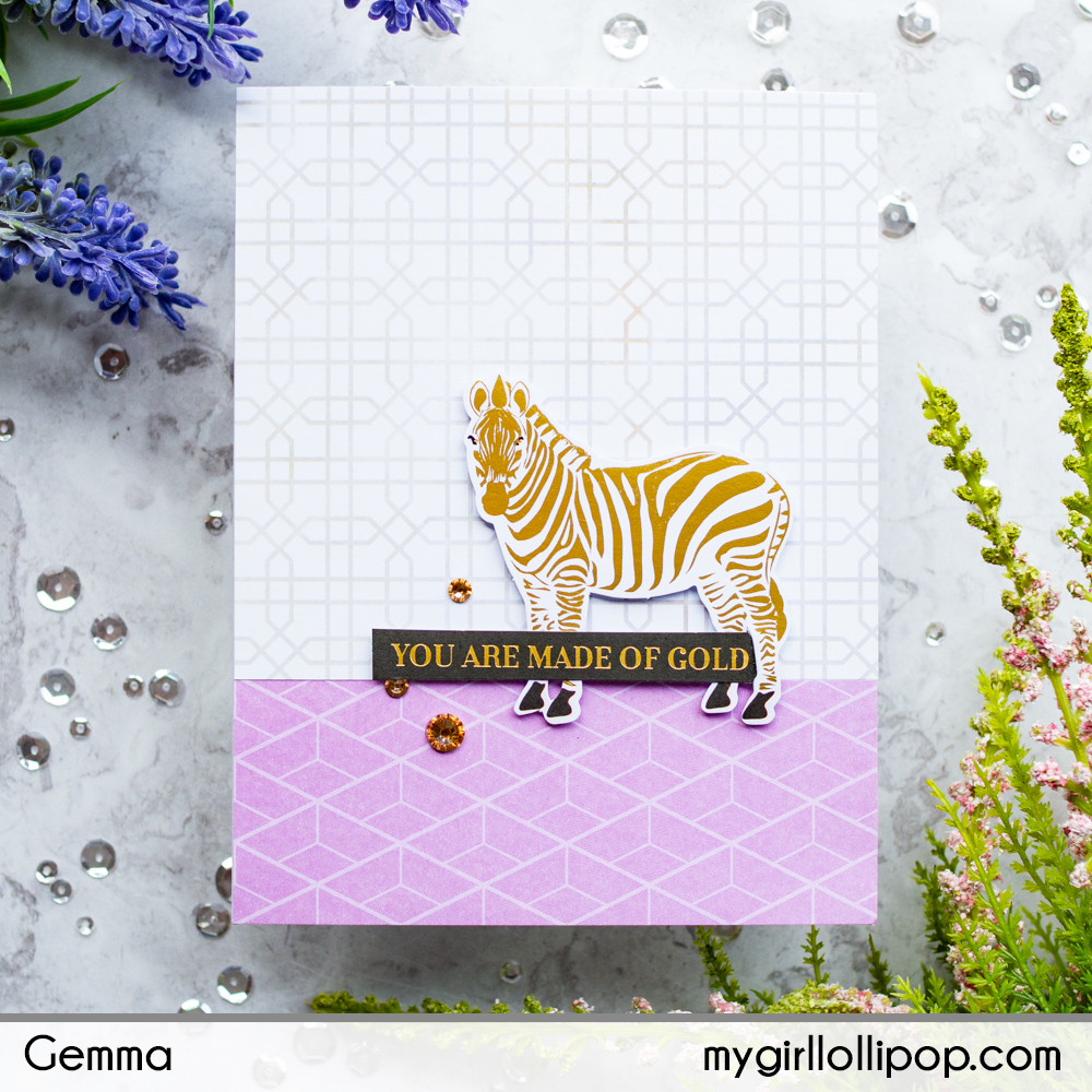 - Add a die cut shape zebra and sentiment to the card with foam squares.