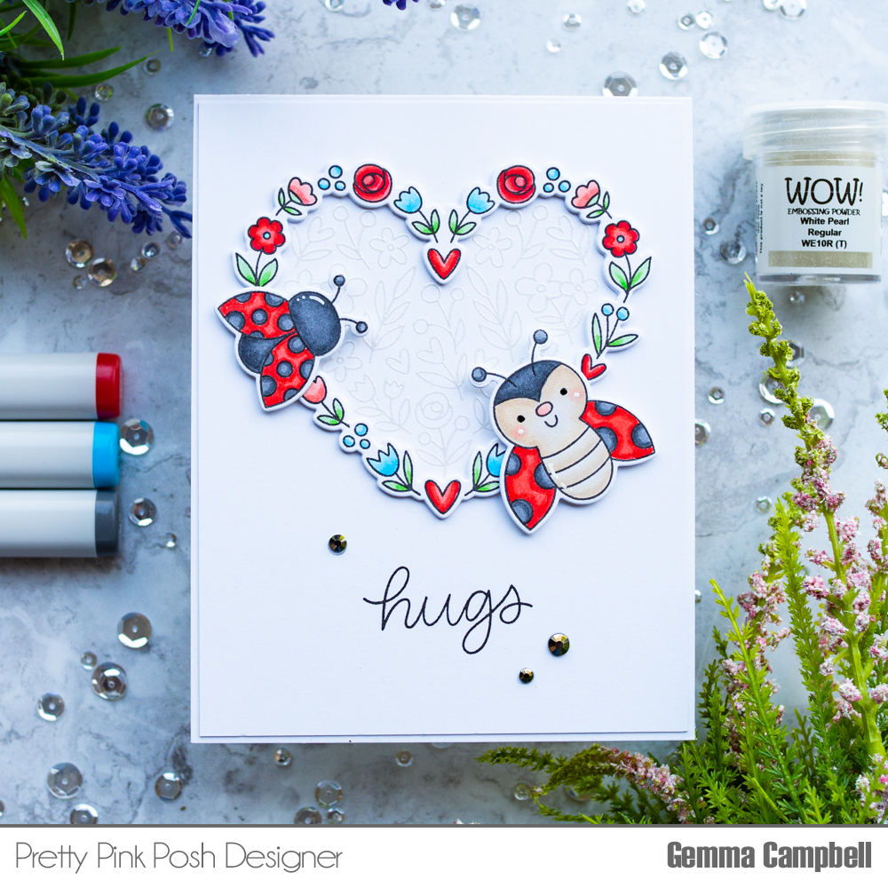 I stamped and copic coloured images from the Ladybug Friends and Large Floral Hearts stamp set, then die cut them with the coordinating dies.