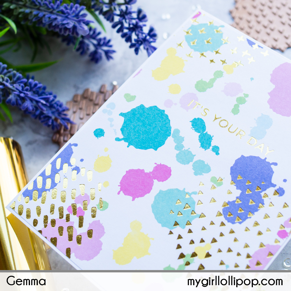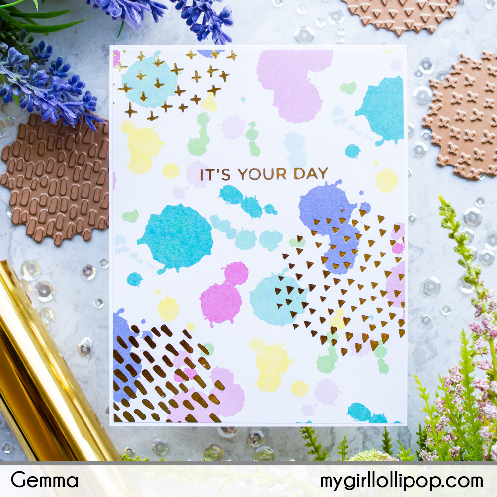 Next, I used the same gold foil with the Art Studio Glimmer plates, to add foiled patterns to the backgrounds.