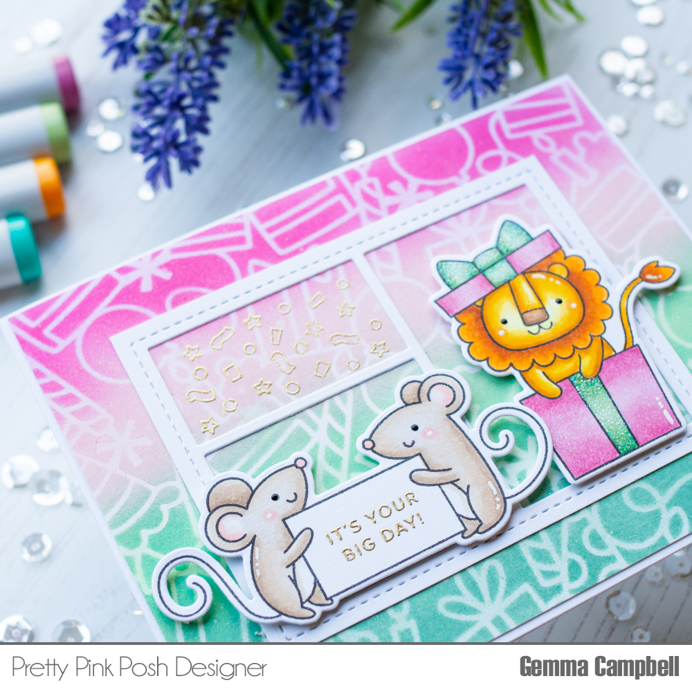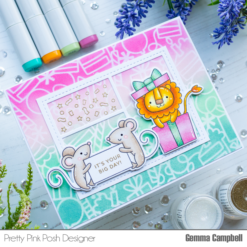 I always need birthday cards on hand so the new Party Friends stamp set from Pretty Pink Posh is perfect.
