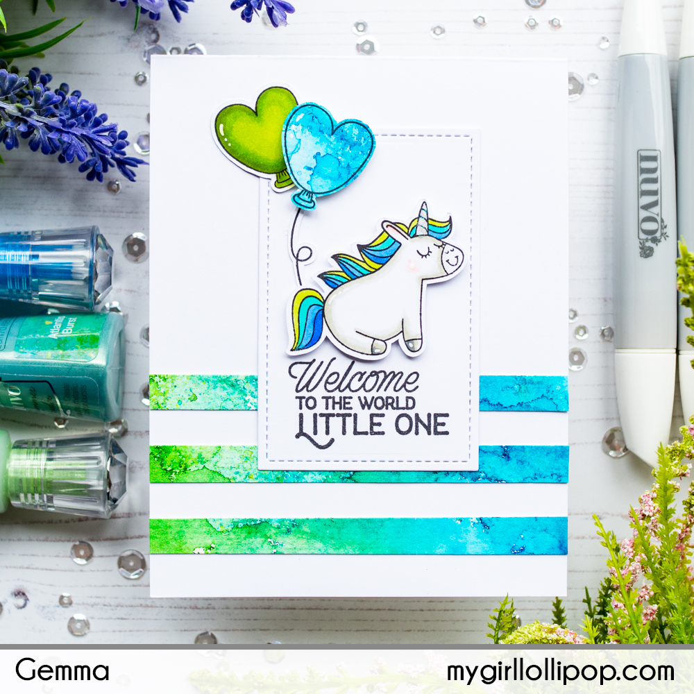 - Stamp the unicorns from Unicorn Wishes, colour them with Nuvo Alcohol marker pens, then cut out.