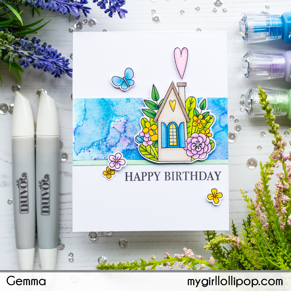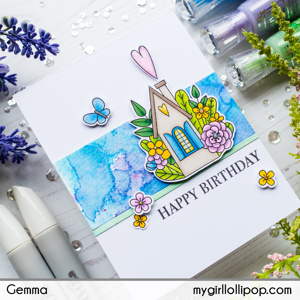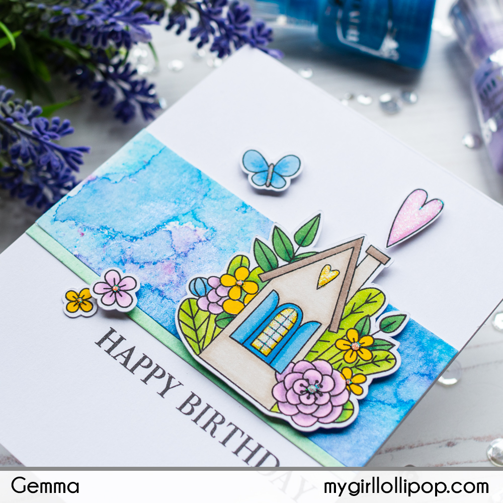 I used the large house and flower image on this card, and coordinated the colouring with my watercolour shimmer background.