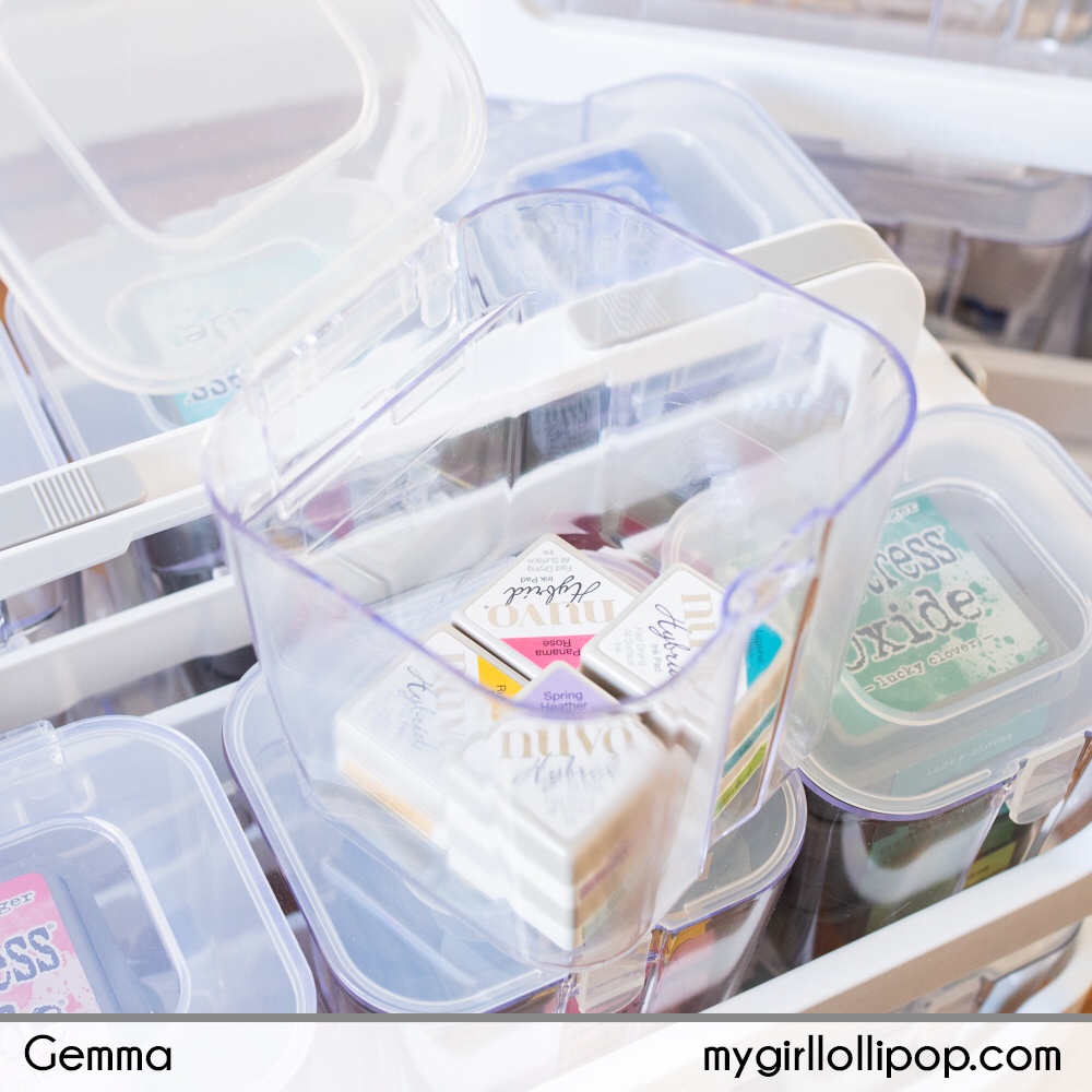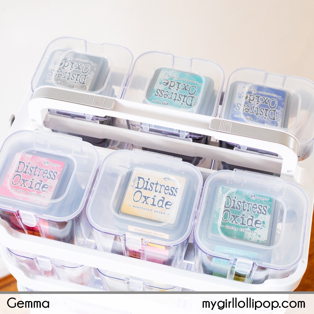 I’ve filled one caddy with 6 small bins, then organised my distress oxides by colour. This caddy will sit on the top of the stack as I reach for my distress oxides all the time.