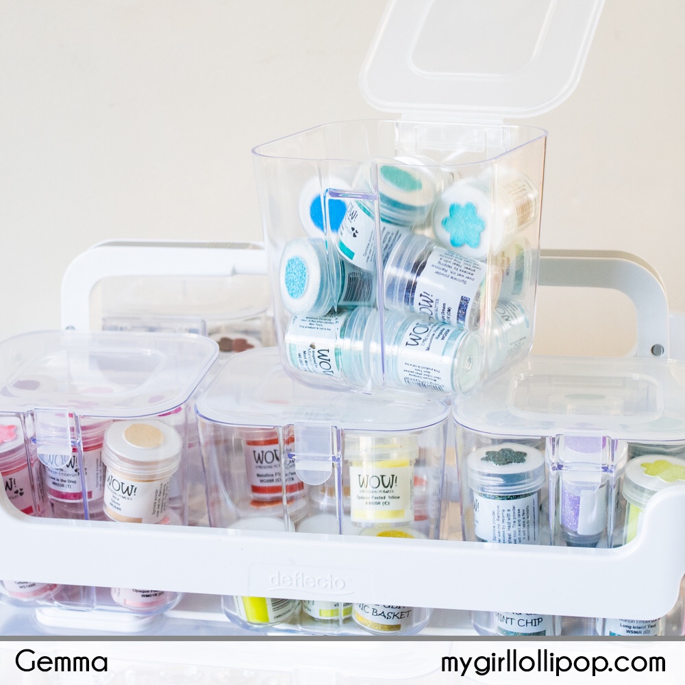 Before this, I had all my embossing powder jars together in one storage box and it took ages to find the right colour. It will be so much easier now I’m using the Deflecto storage caddy bins.