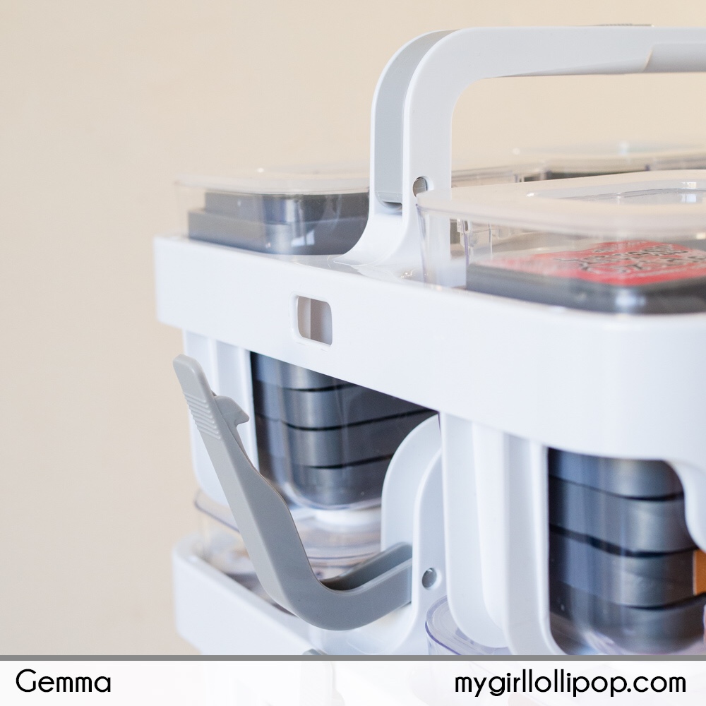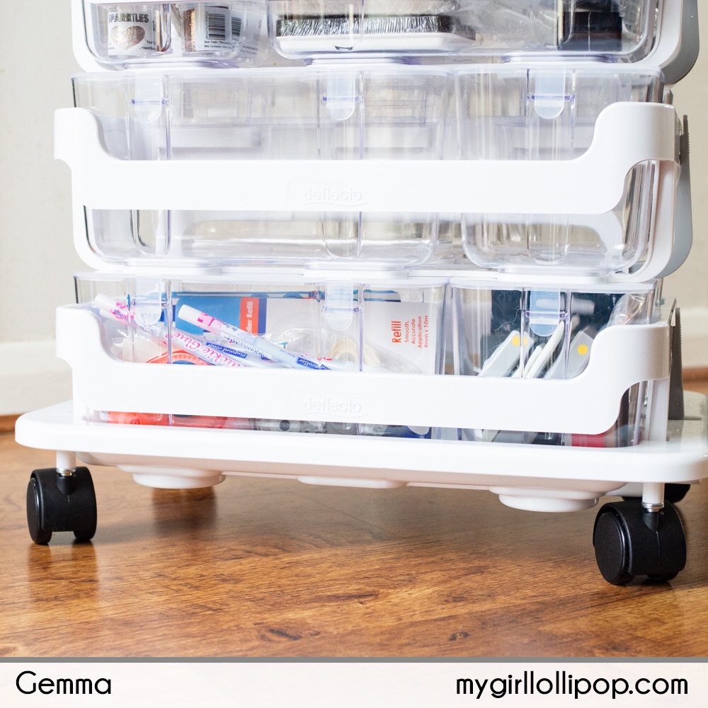 I thought I’d share how I’ve organised some of my supplies in the caddies. I’m still in the process of organising so not all the bins are filled yet. In fact, I have a whole empty layer waiting for craft supplies.