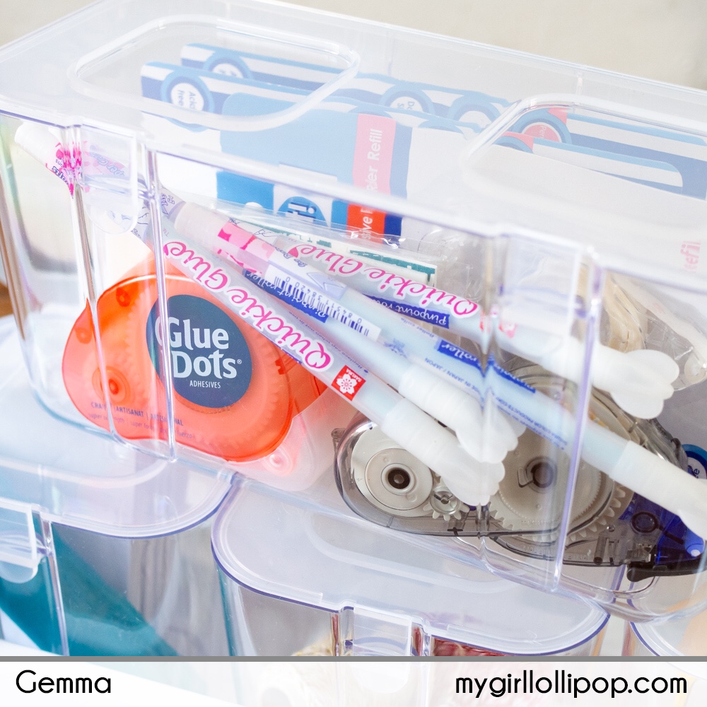 These caddies are designed so well. Each caddy has clear storage bins, which fit into the caddy. Storage bins are available in 3 sizes so it’s really easy to mix and match the bins to work with your supplies.