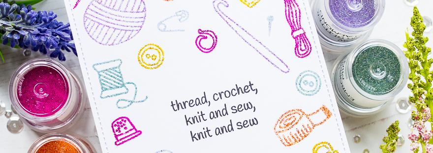 I have a bright, fun, and very glittery card to share today. I used the WOW Simply Sew stamp set and 6 beautiful embossing glitters.