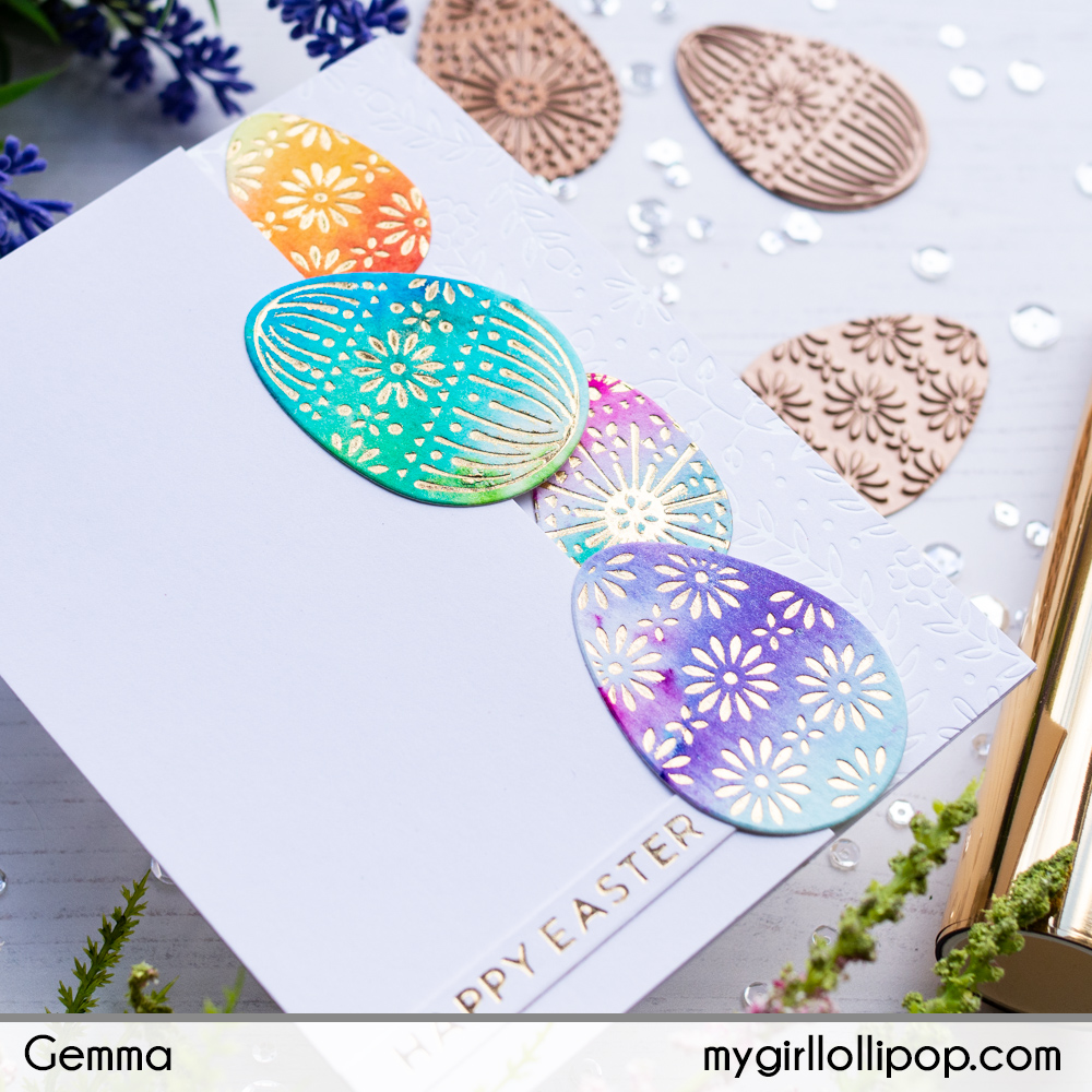 I had some backgrounds I’d previously created with Nuvo shimmer powders, so decided to use these for my Easter eggs. I chose Polished Brass foil, which is my favourite metallic glimmer foil.