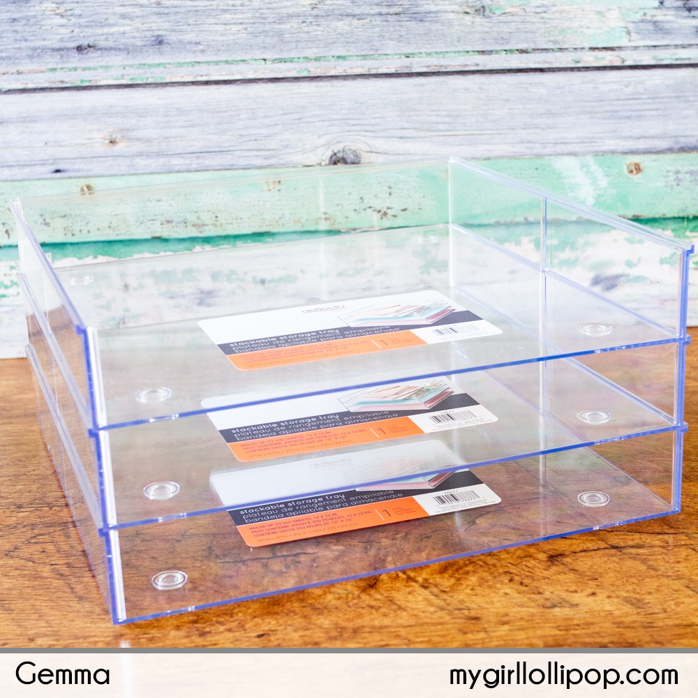 Today I’m trying the Deflecto Stackable Storage Trays. These clear trays fit 12×12 papers and, as the name suggests, they stack very neatly together. You get a set of 3 trays and you can stack them higher as needed.
