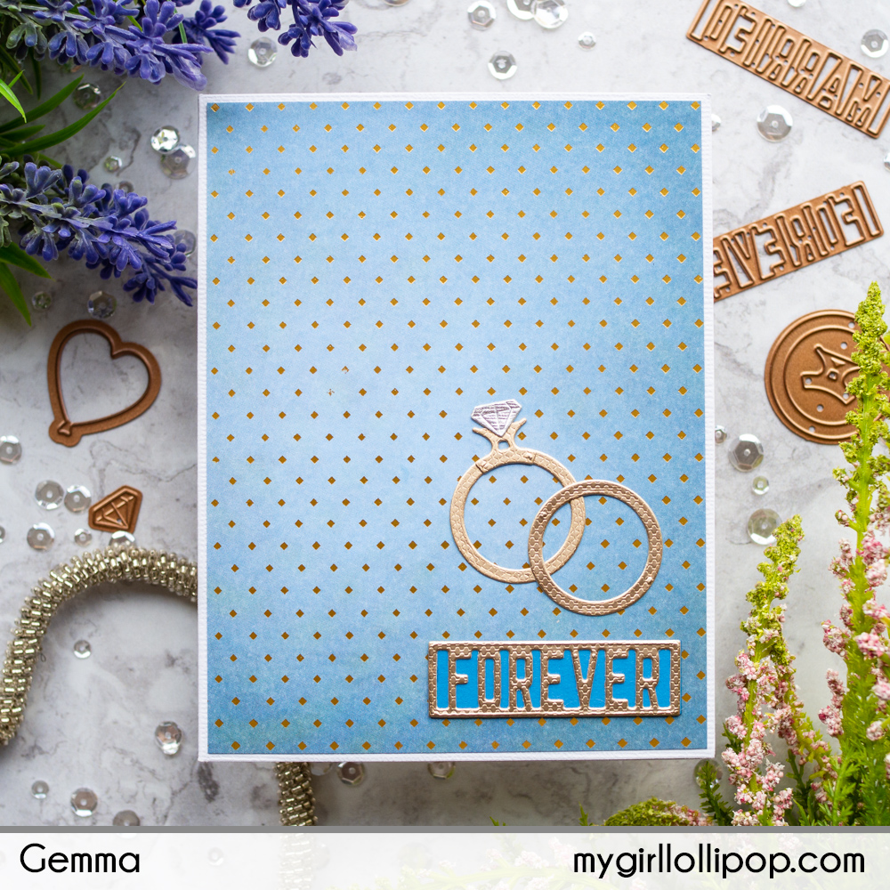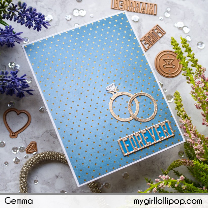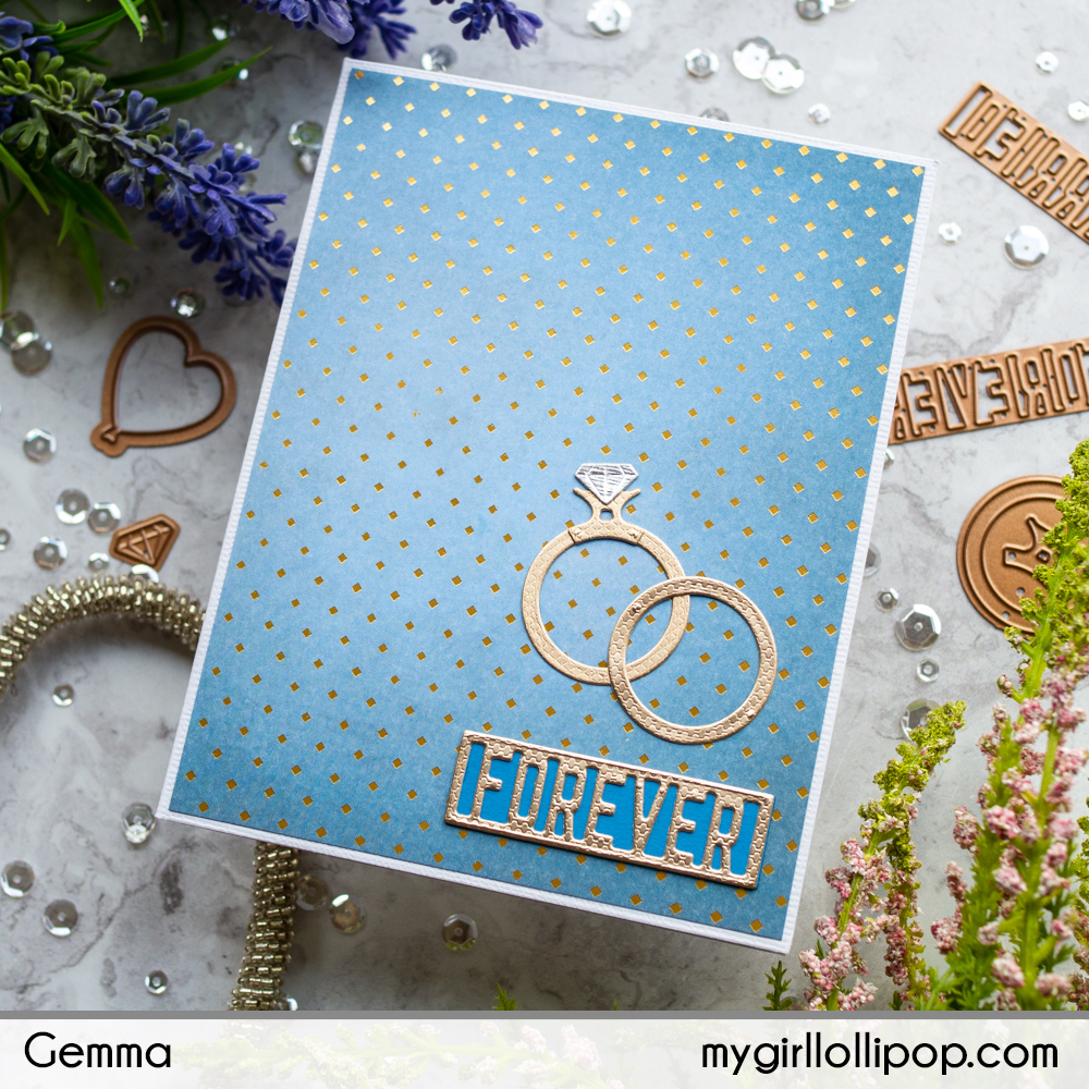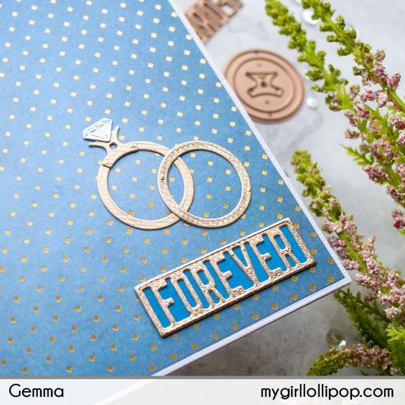 I cut a piece of foiled patterned paper from the Spellbinders Love the Moment paper pad and adhered to my card base. I then added the rings and sentiment to finish.