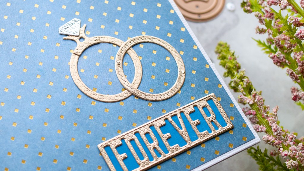 I began by die cutting the wedding rings and forever sentiment from Tonic Studios Golden Mosaic embossed card.