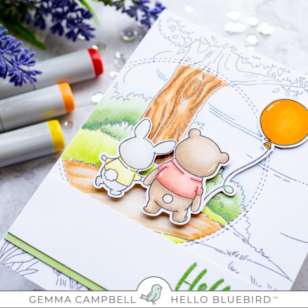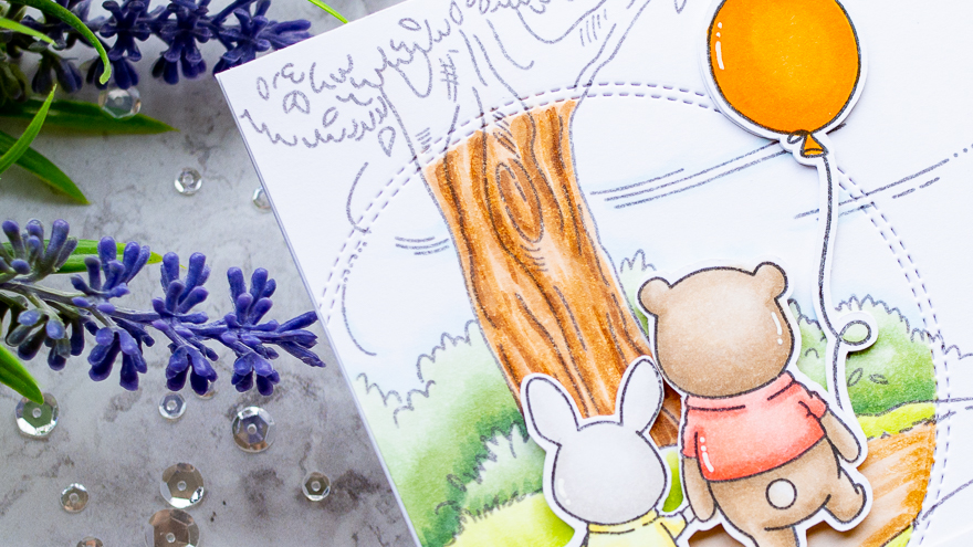 I felt like the bear needed a balloon to complete the card, so I added one from the Party on the Farm stamp set. I love the little splash of colour escaping from the circle scene.