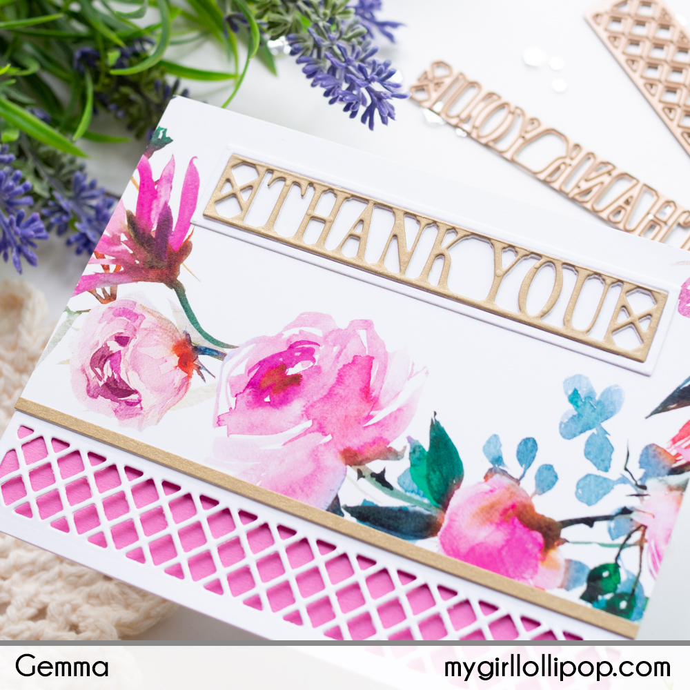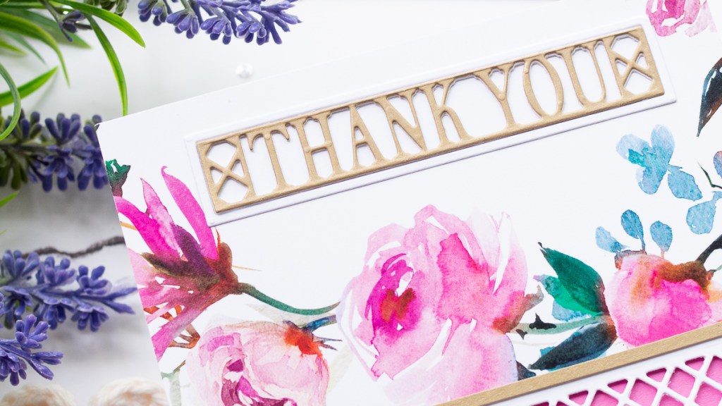 For the sentiment, I die cut the thank you die from the set from white card and gold pearlescent card. I layered the gold die over in the white, then adhered to my card. I also added the white frame around the sentiment.