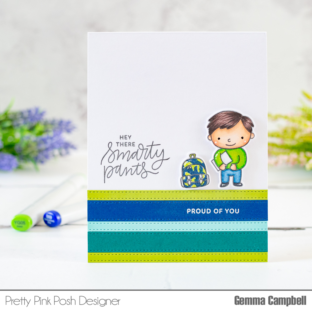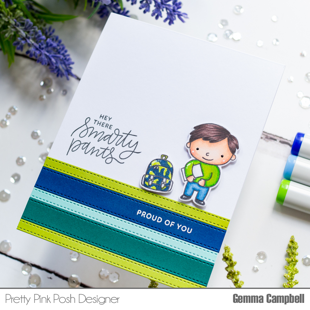 I used the fun School Friends stamp set from Pretty Pink Posh. I coloured the images with copic markers, customising the bag to look like my nephew’s school bag.
