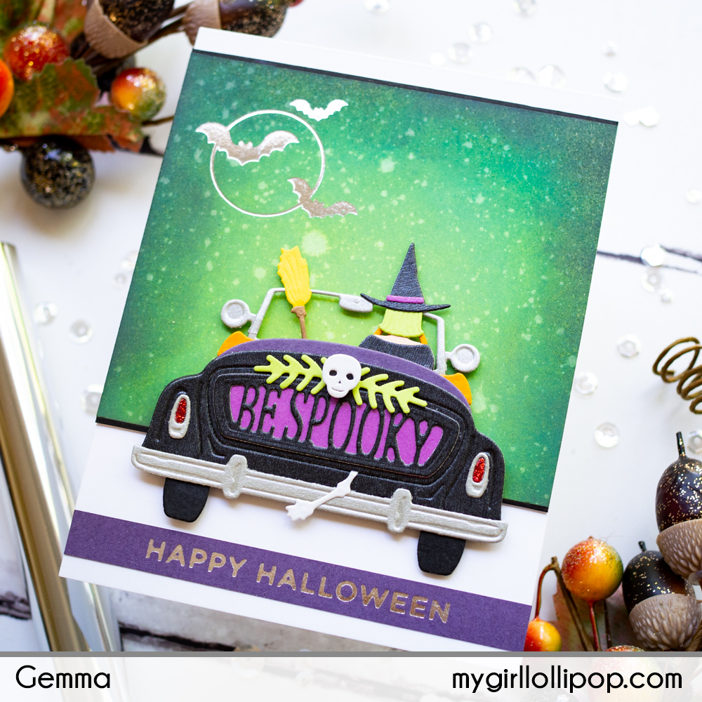 This collection has a mix of dies and glimmer sets for making fun seasonal cards. There are 2 sets for Fall and 4 sets for Halloween. My card today uses the fun Spooky Greetings glimmer set along with the Halloween Sunday Drive die set.