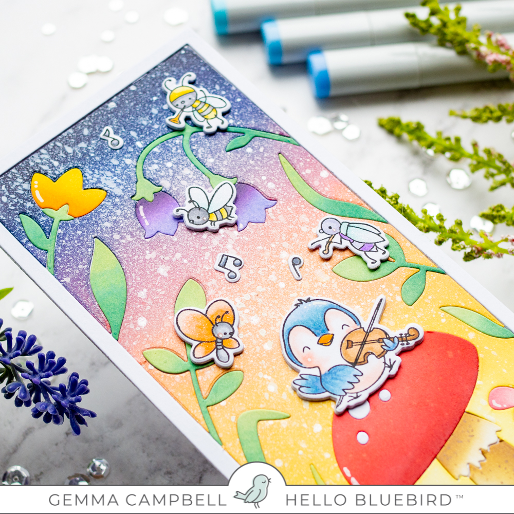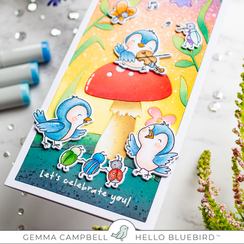Today I’m sharing a card featuring the fabulous new Fairy Glade Vertical slimline die from Hello Bluebird. Teamed with the Garden Party stamp set, it’s easy to create fabulous scenes.