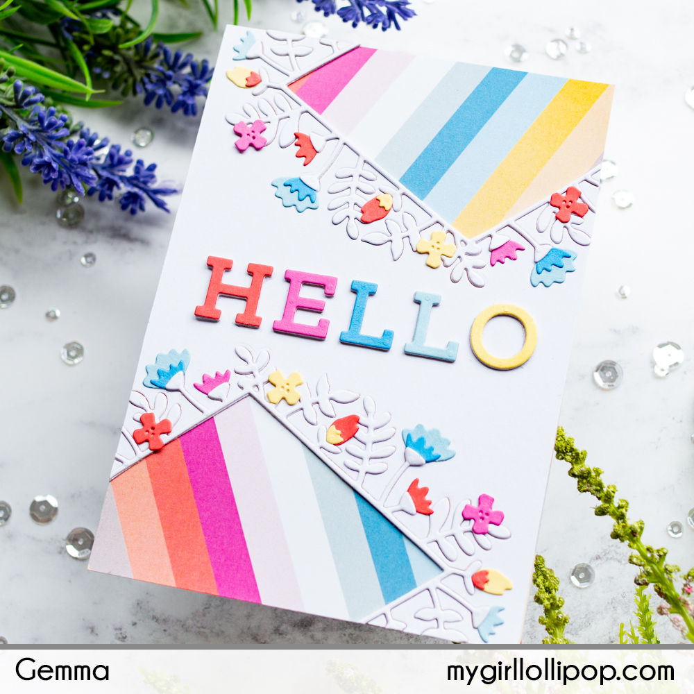I chose some coloured card stock to match the colours of the patterned paper. I die cut the letters from the kit to spell hello, layering them for dimension and adhering them across the centre.