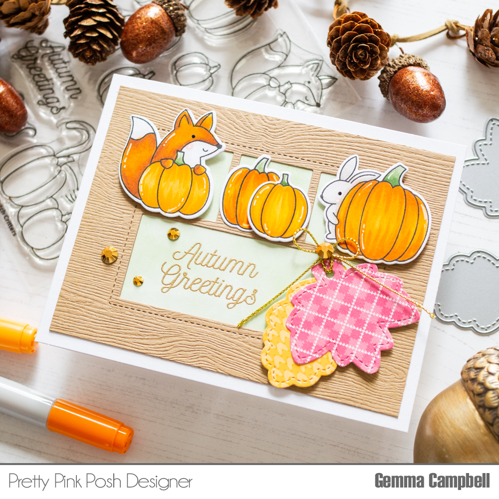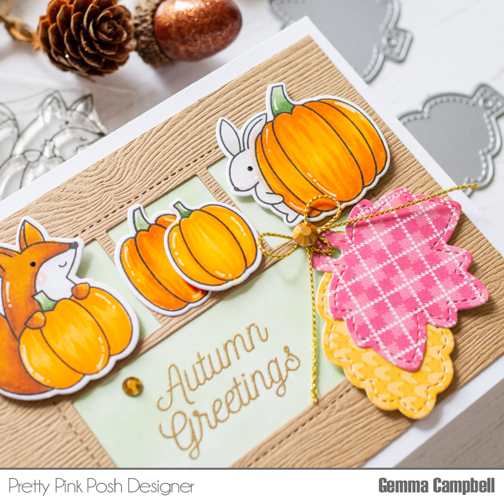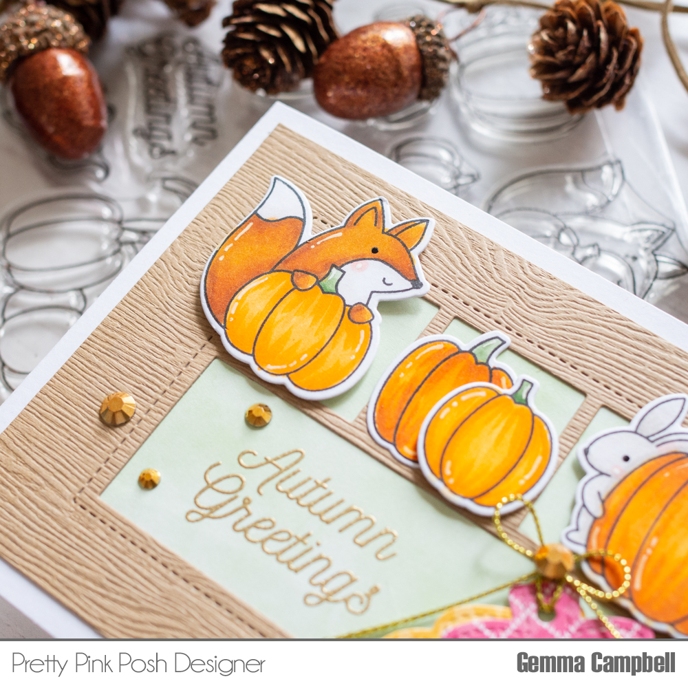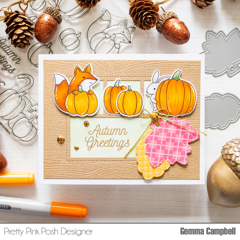 Today I’m sharing a card featuring the adorable Pumpkin Patch Critters from Pretty Pink Posh. I love the animals in this set, peeking out from behind the pumpkins.