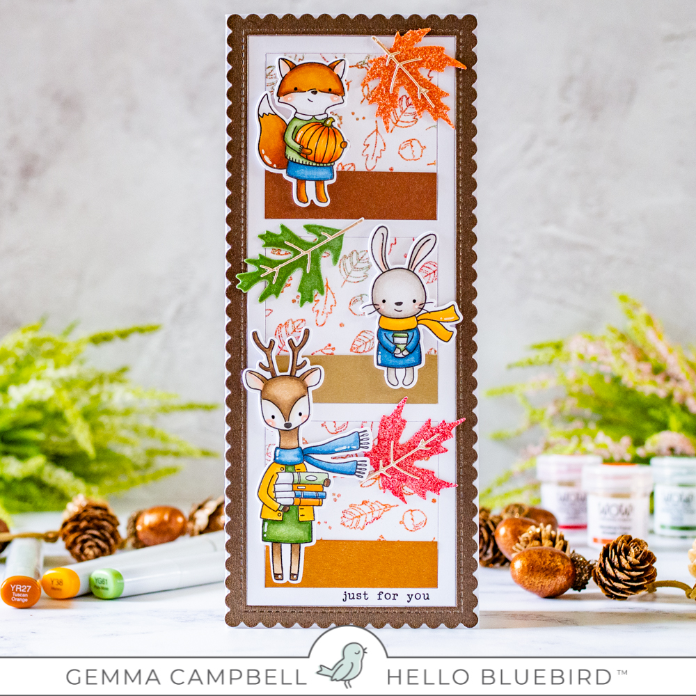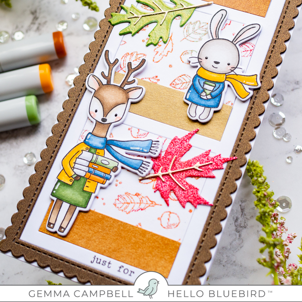 I’ve combined some older Hello Bluebird Autumn sets with the new Gallery Frame #5 slimline die on my card today.