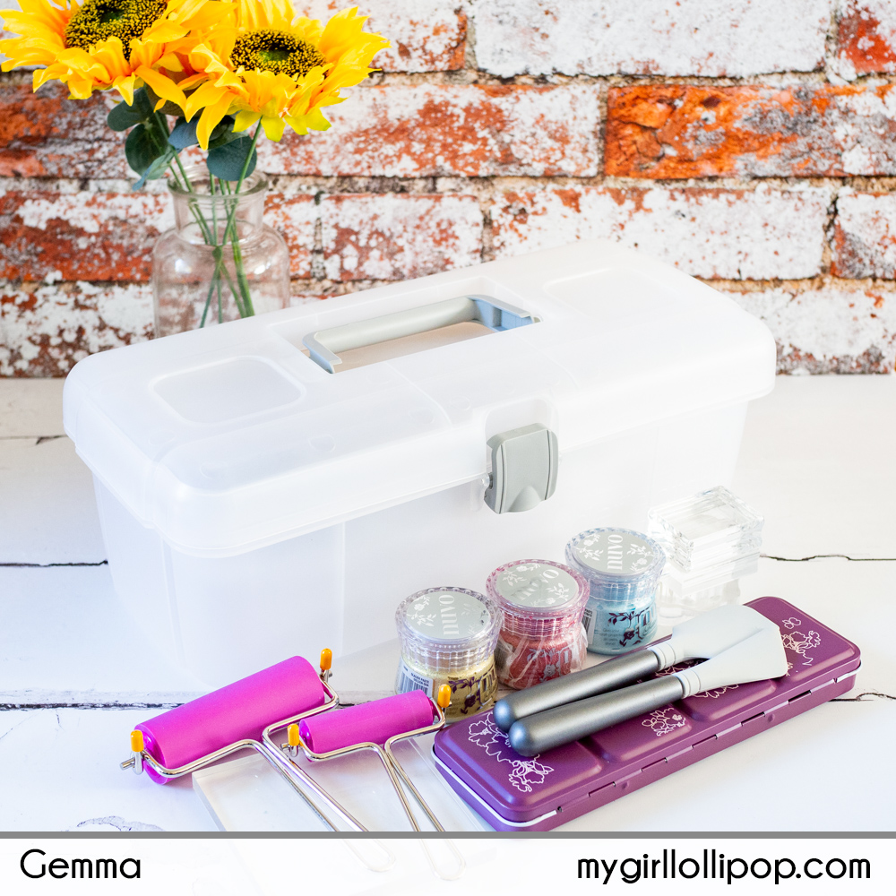There is a sturdy handle and two long compartments, which are perfect for brushes, scissors, ink pads, and other supplies.