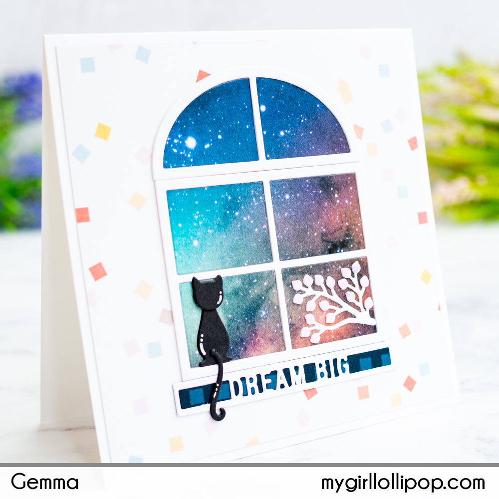This month, you get the Daydreaming set of 17 cutting dies. Use the included dies to add a window scene or create your own for the sweet cat to gaze out on.