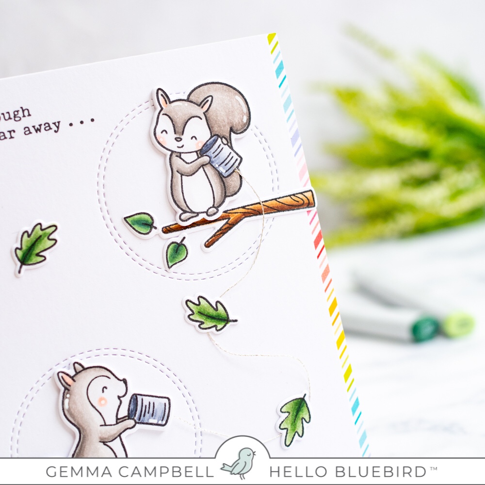 I adhered the branches on the card with liquid glue. I added some extra die cut layers behind the squirrels, for dimension, then adhered them to the card. I added some silver thread between them, to connect the tin can phones.