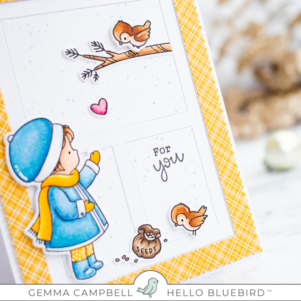 The recent Winter release from Hello Bluebird included the most adorable stamp set, called Feed the Birds. I think Hello Bluebird has some of the best people images and they do this vintage style so well. The images are always enjoyable to colour.